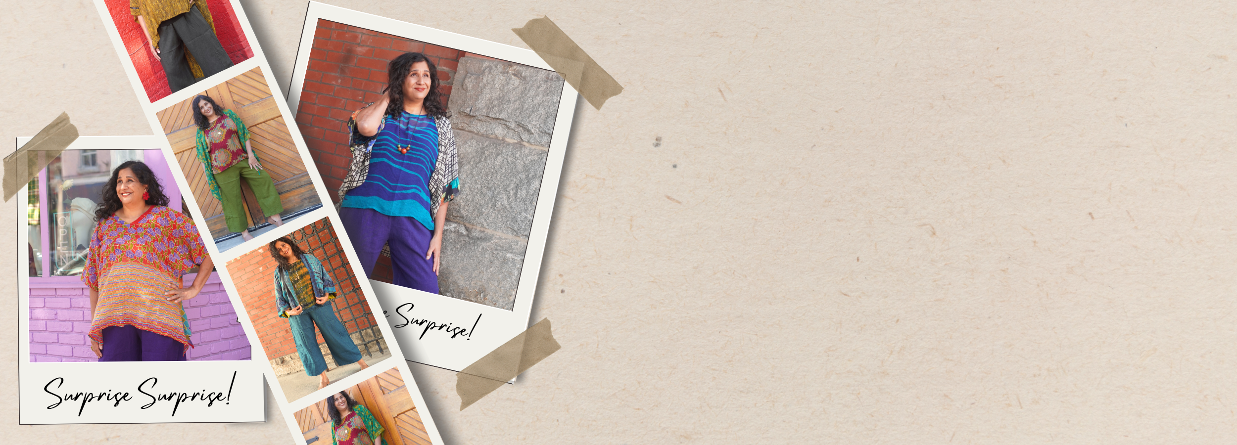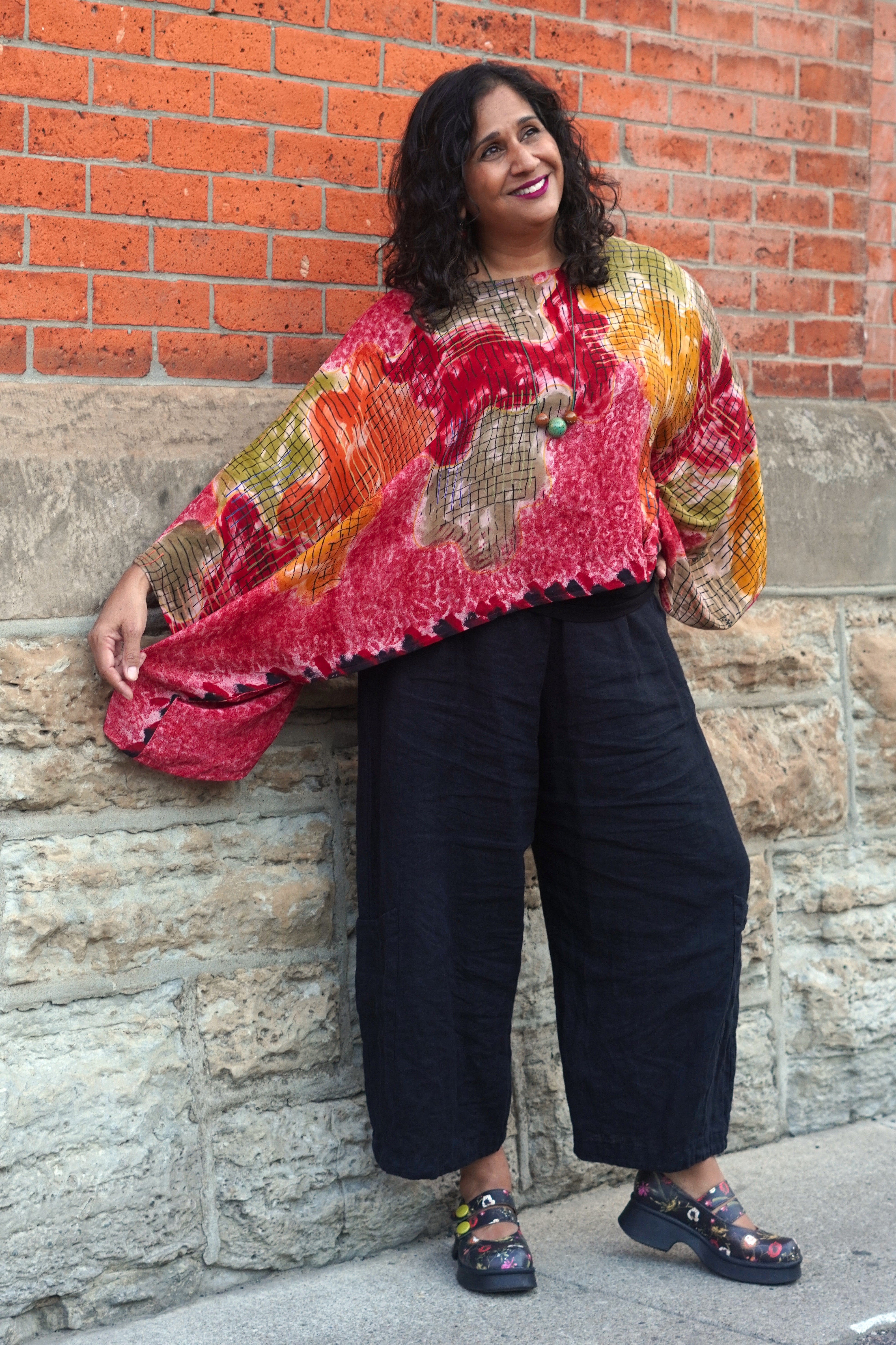 Our Upcycled Vintage Pure Silk Collection is made from vintage South Asian pure silk saris. We hand-pick every single sari to find colours that will match your existing basics while adding a pop of personality and colour. Because each sari consists of only 5.5 yards of fabric, we can only make one of each item which ensures that your wardrobe is as one-of-a-kind as you are!