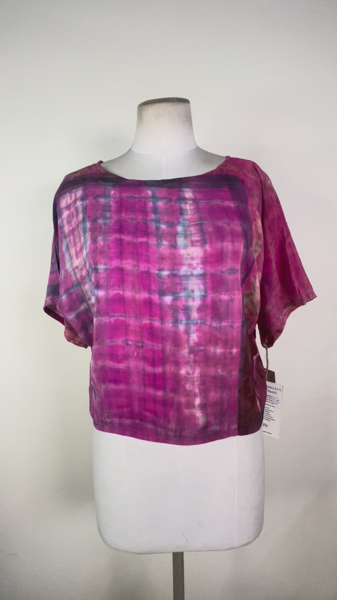 These sustainable, pure silk boxy tops are versatile and come in countless colors and prints. They look great when paired with a longer tank top and high-waisted pants, or beneath a coordinating kimono-sleeved duster, short kimono-sleeved jacket, or silk poncho. These pieces are one size, best fitting sizes 2-12, but please consult the product description for exact measurements.
