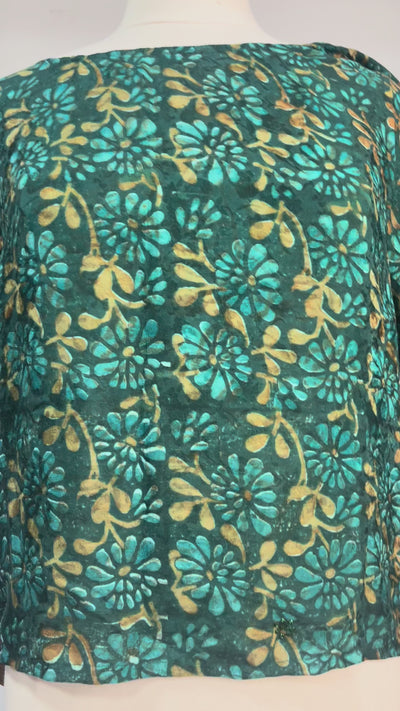 These sustainable, pure silk boxy tops are versatile and come in countless colors and prints. They look great when paired with a longer tank top and high-waisted pants, or beneath a coordinating kimono-sleeved duster, short kimono-sleeved jacket, or silk poncho. These pieces are one size, best fitting sizes 2-12, but please consult the product description for exact measurements.