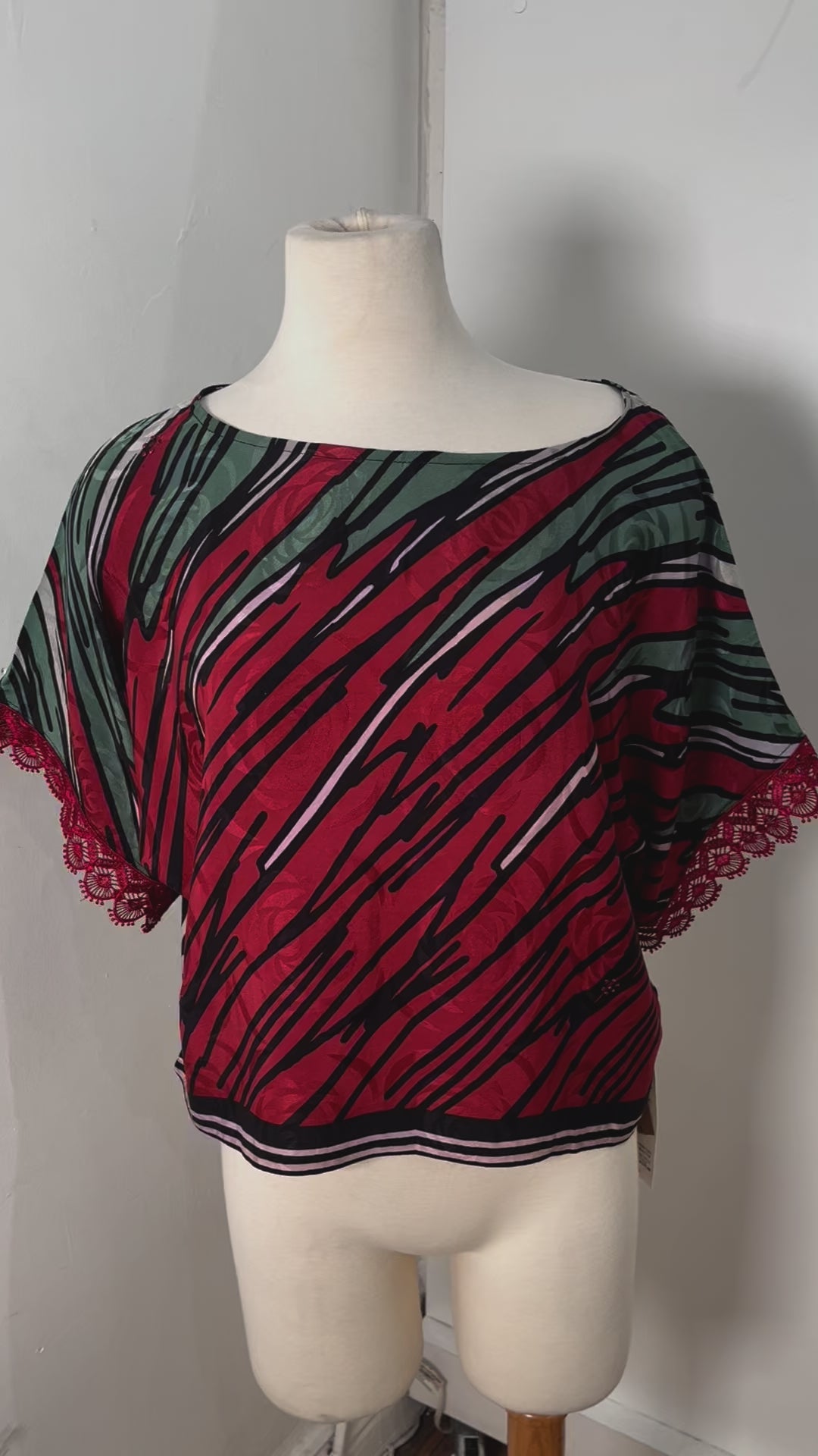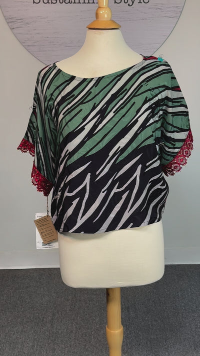 These sustainable, pure silk boxy tops are versatile and come in countless colors and prints. They look great when paired with a longer tank top and high-waisted pants, or beneath a coordinating kimono-sleeved duster, short kimono-sleeved jacket, or silk poncho. These pieces are one size, best fitting sizes 2-12, but please consult the product description for exact measurements.