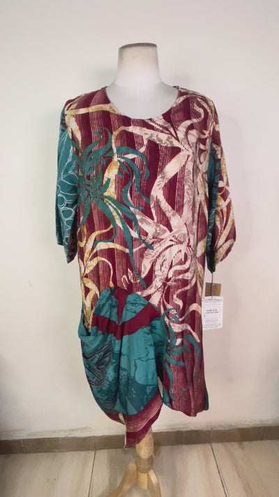 Customers are drawn to the unique, asymmetrical hemline and sculptural self-pocket design of this tunic, available in a multitude of colors and patterns. Crafted of upcycled crepe or georgette silk for supreme comfort and a flattering fit, this piece features a generous cut that fits most sizes. Confirm exact measurements on the Video tab below and explore styling tips with the accompanying video.