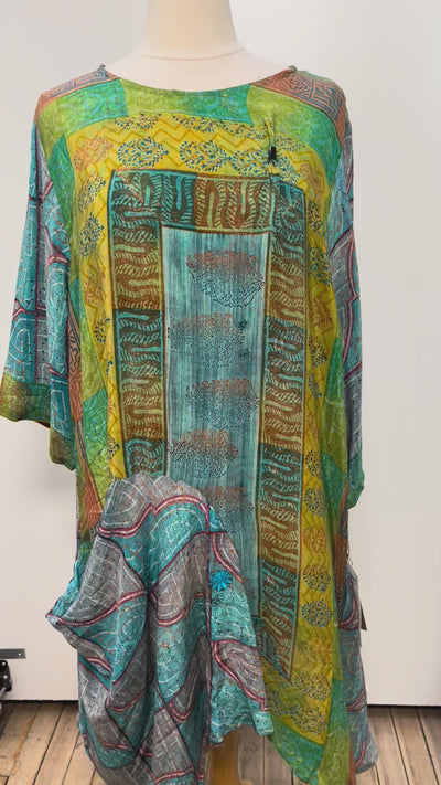 Customers are drawn to the unique, asymmetrical hemline and sculptural self-pocket design of this tunic, available in a multitude of colors and patterns. Crafted of upcycled crepe or georgette silk for supreme comfort and a flattering fit, this piece features a generous cut that fits most sizes. Confirm exact measurements on the Video tab below and explore styling tips with the accompanying video.