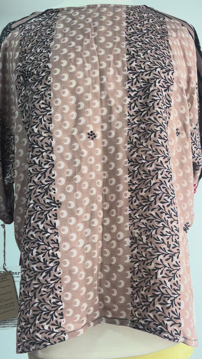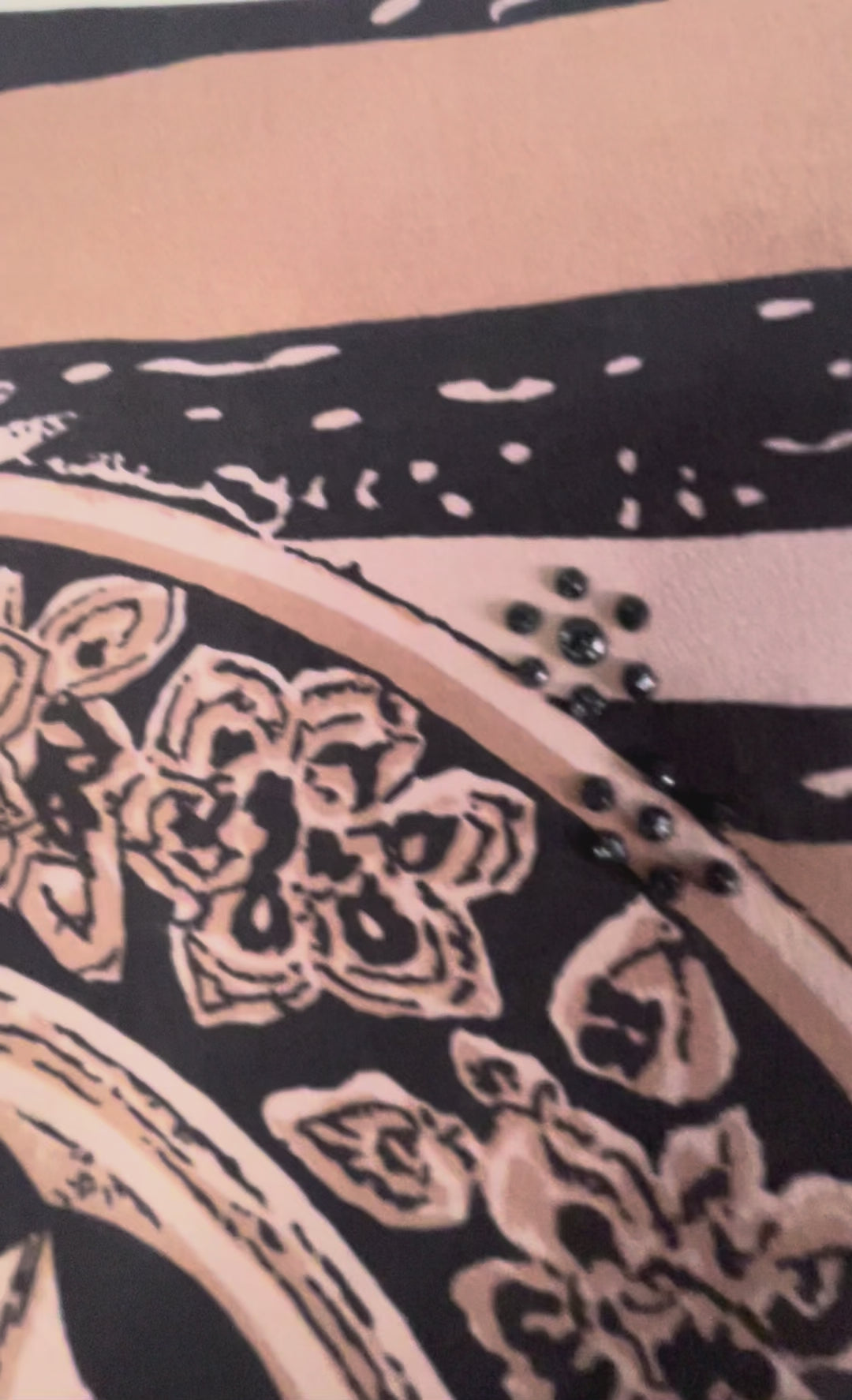 Sometimes you can see the sari-maker’s brand stamp on a piece of silk that we have transformed into another type of garment. We think the brand stamps are charming and that they don’t detract from our products, but because we also sell our clothing to boutiques around the world, we pull these “branded” products and add them to our wabi sabi or “perfectly imperfect” collection. Generally, if the piece you are interested in has a brand tag, you will be able to see its exact location in the product video.