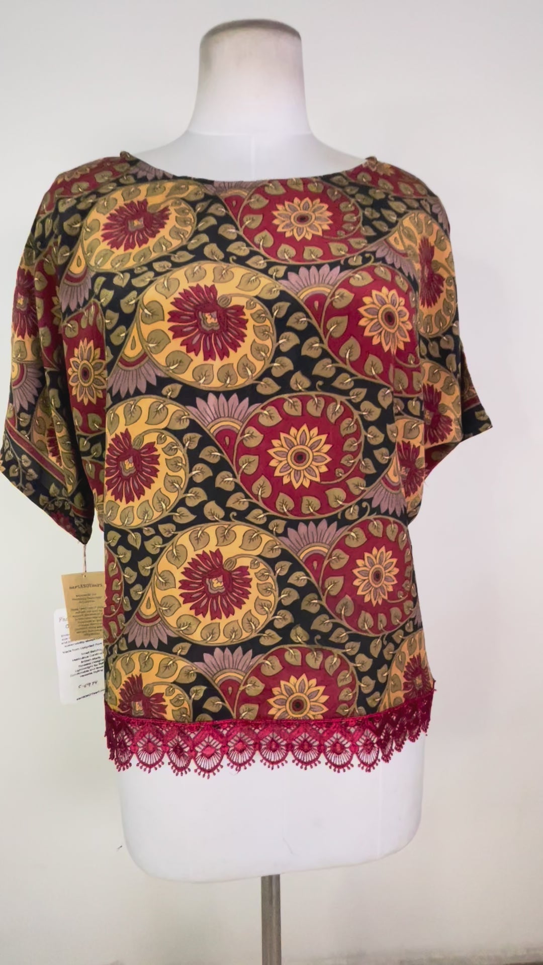 Sometimes you can see the sari-maker’s brand stamp on a piece of silk that we have transformed into another type of garment. We think the brand stamps are charming and that they don’t detract from our products, but because we also sell our clothing to boutiques around the world, we pull these “branded” products and add them to our wabi sabi or “perfectly imperfect” collection. Generally, if the piece you are interested in has a brand tag, you will be able to see its exact location in the product video.