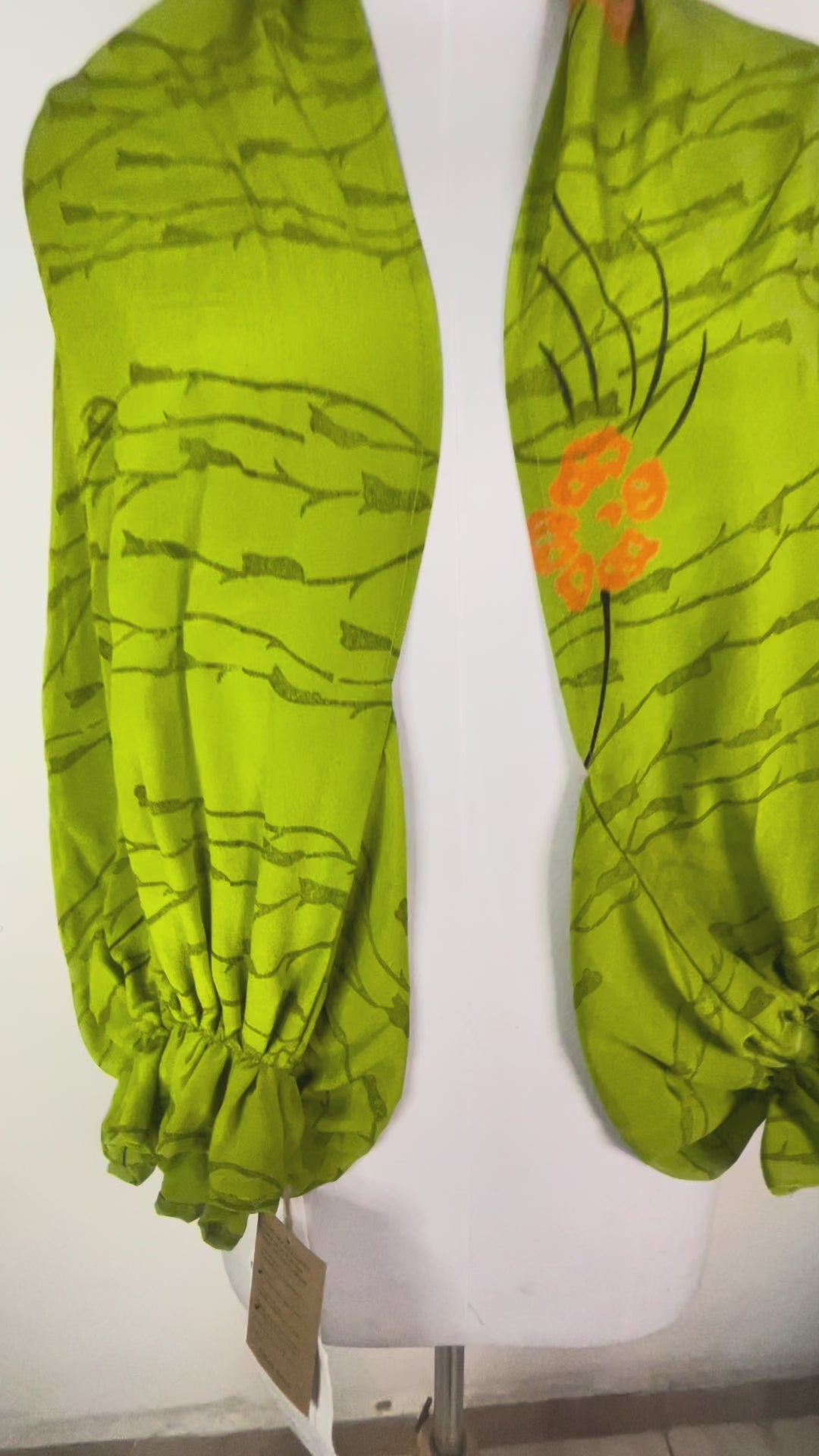 Sometimes you can see the sari-maker’s brand stamp on a piece of silk that we have transformed into another type of garment. We think the brand stamps are charming and that they don’t detract from our products, but because we also sell our clothing to boutiques around the world, we pull these “branded” products and add them to our wabi sabi or “perfectly imperfect” collection. Generally, if the piece you are interested in has a brand tag, you will be able to see its exact location in the product video.