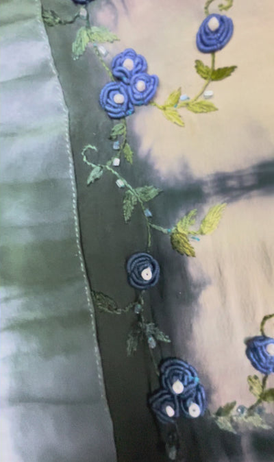 If you look very closely, you will see that the silks in this collection show some of the character of their previous incarnations through the appliqués that have been lovingly applied to bring new life to the fabric. This piece is a reminder that we are part of a collective journey to which we all add a little something.
