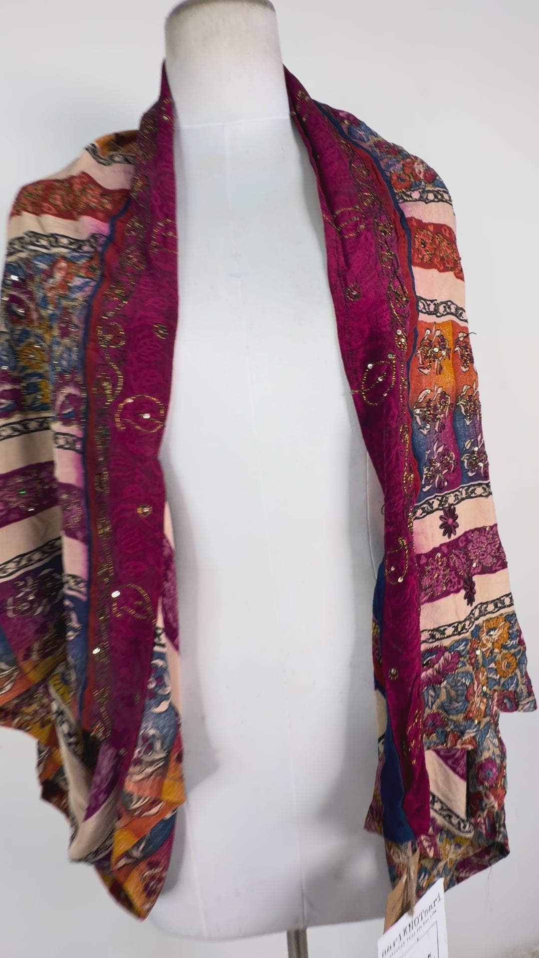 Sometimes you can see the sari-maker’s brand stamp on a piece of silk that we have transformed into another type of garment. We think the brand stamps are charming and that they don’t detract from our products, but because we also sell our clothing to boutiques around the world, we pull these “branded” products and add them to our wabi sabi or “perfectly imperfect” collection. Generally, if the piece you are interested in has a brand tag, you will be able to see its exact location in the product video.