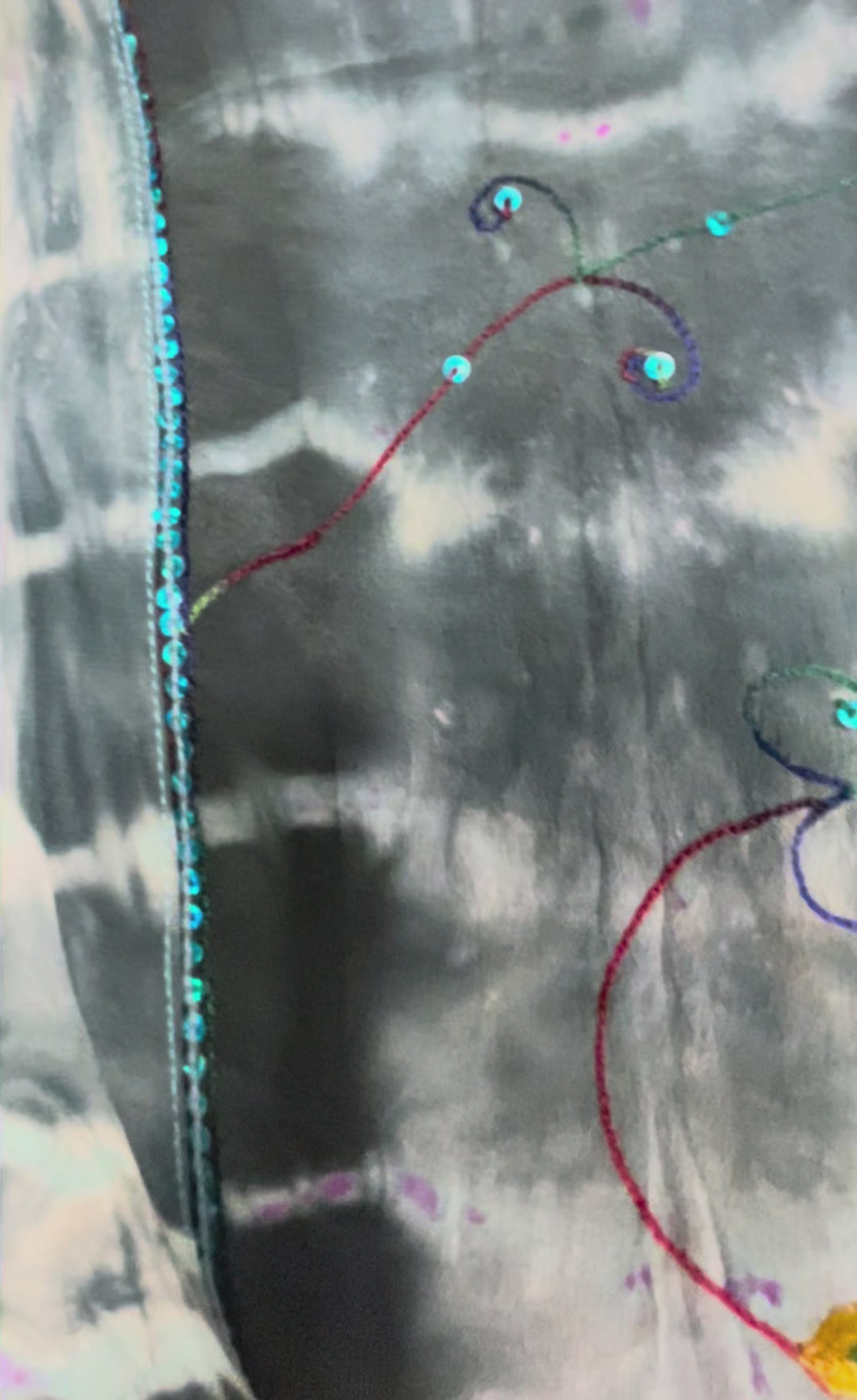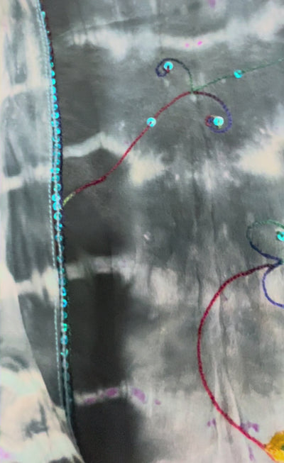 If you look very closely, you will see that the silks in this collection show some of the character of their previous incarnations through the appliqués that have been lovingly applied to bring new life to the fabric. This piece is a reminder that we are part of a collective journey to which we all add a little something.