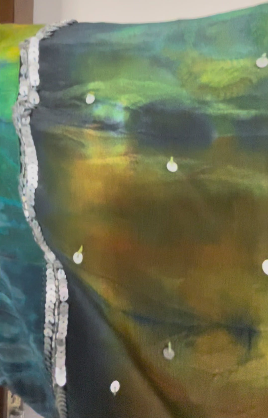 If you look very closely, you will see that the silks in this collection show some of the character of their previous incarnations through the appliqués that have been lovingly applied to bring new life to the fabric. This piece is a reminder that we are part of a collective journey to which we all add a little something.