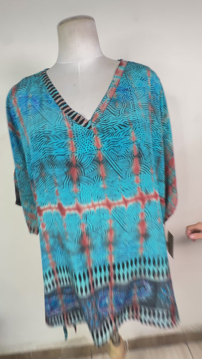 This tunic is long enough to provide full coverage, while adjustability is provided by side ties. This style accommodates all body types with a v-neckline on one side and a crew neckline on the other, so whichever side is worn to the front, you are sure to look great. Generously-cut so it fits sizes 2-18, but refer to the sizing tab for the exact measurements.