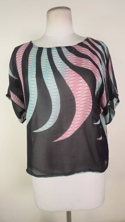 These sustainable, pure silk boxy tops are versatile and come in countless colors and prints. They look great when paired with a longer tank top and high-waisted pants, or beneath a coordinating kimono-sleeved duster, short kimono-sleeved jacket, or silk poncho. These pieces are one size, best fitting sizes 2-12, but please consult the product description for exact measurements.