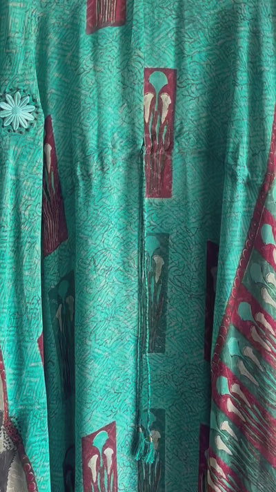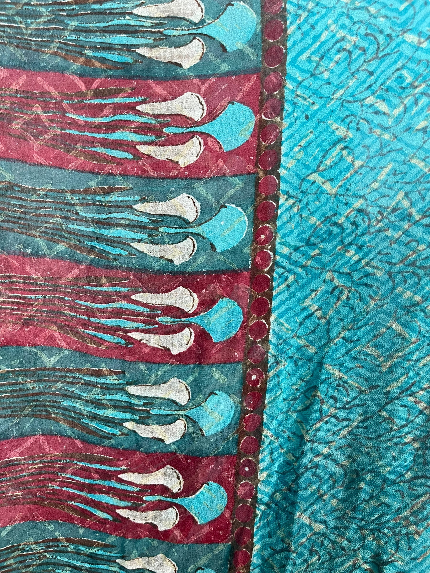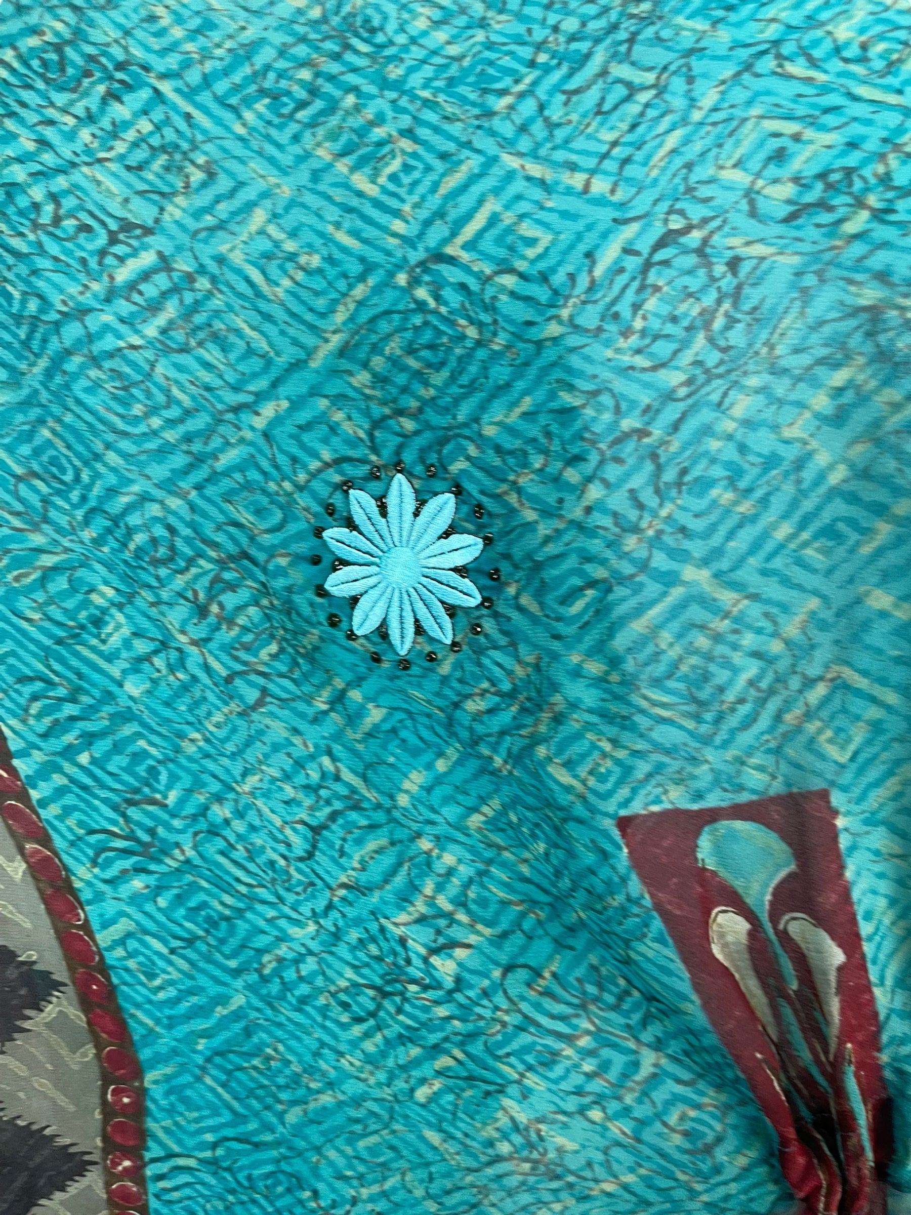 In Eastern philosophy, an Avatar is an incarnation that teaches how to evolve virtues of the past into the present. The Pure Upcycled Silk Avatar Collection is made from vintage pure silk saris, chosen and worn by women in the past to celebrate their lives.If you look very closely, you will see that the silks in this collection show some of the character of their previous incarnations through the appliqués that have been lovingly applied to bring new life to the fabric. This piece is a reminder that we are part of a collective journey to which we all add a little something.