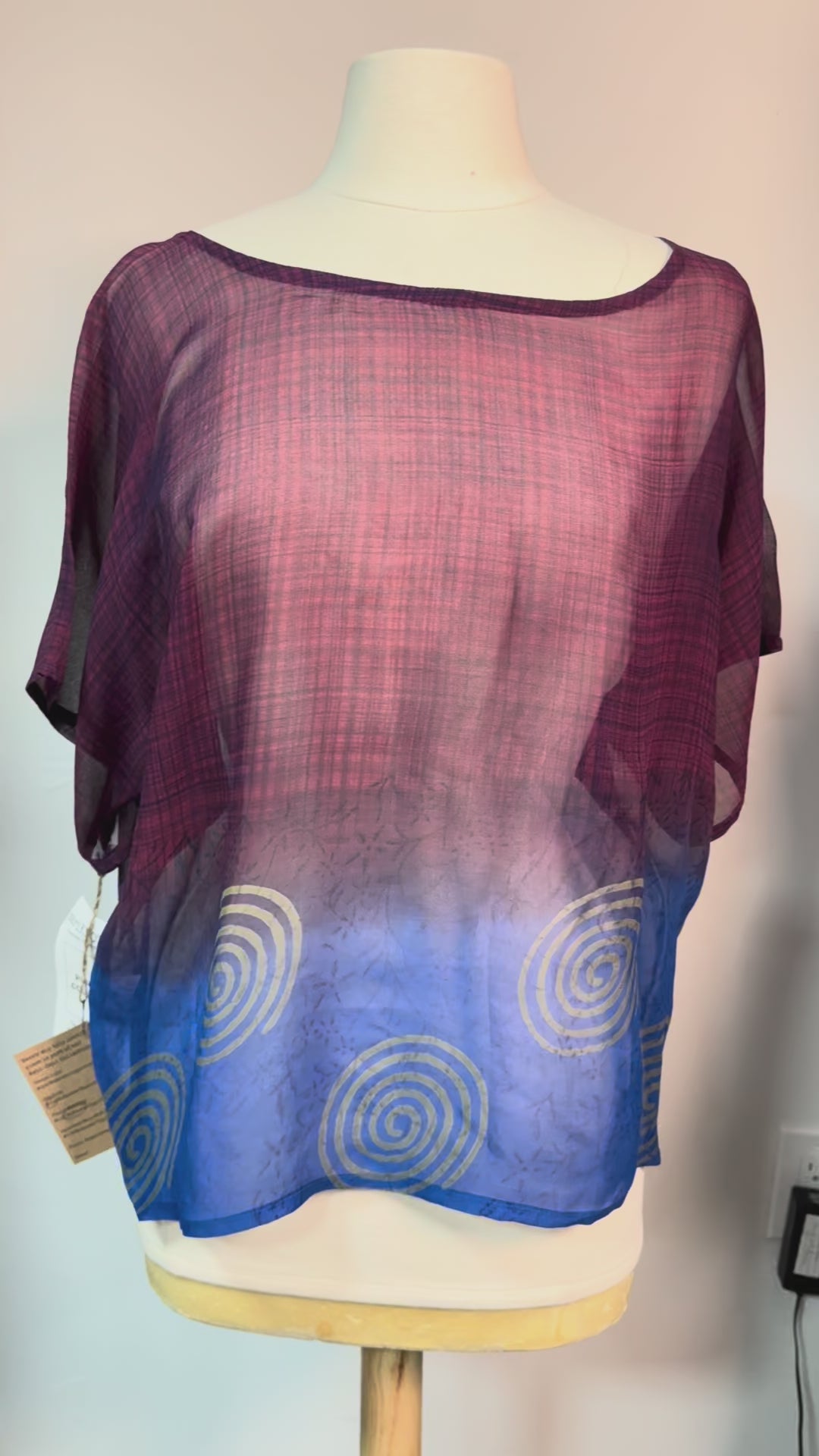 These sustainable, pure silk boxy tops are versatile and come in countless colors and prints. They look great when paired with a longer tank top and high-waisted pants, or beneath a coordinating kimono-sleeved duster, short kimono-sleeved jacket, or silk poncho. These pieces are one size, best fitting sizes 2-12, but please consult the product description for exact measurements.