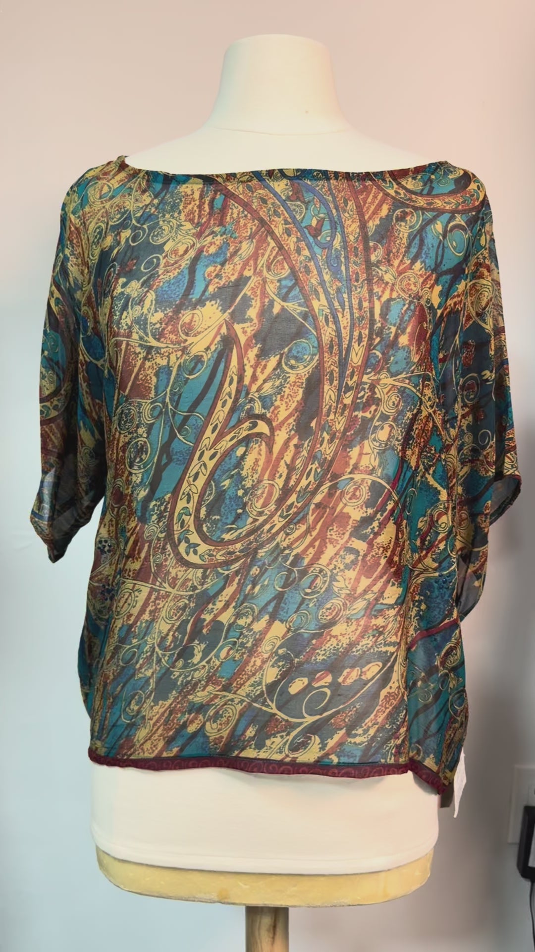 These sustainable, pure silk boxy tops are versatile and come in countless colors and prints. They look great when paired with a longer tank top and high-waisted pants, or beneath a coordinating kimono-sleeved duster, short kimono-sleeved jacket, or silk poncho. These pieces are one size, best fitting sizes 2-12, but please consult the product description for exact measurements.