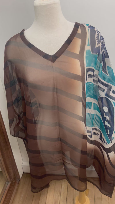 Our Tunic-Length Kaftan Tunic works in every season and works just as well at a date as at the beach. This kaftan is long enough to be worn as a beach cover-up but it can also be worn with pants or leggings in the fall and winter. Made from super-soft upcycled silk crepe saris, the fabric has a flattering drape on every figure.