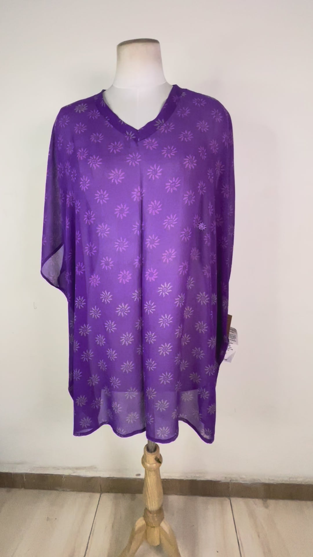 Our Tunic-Length Kaftan Tunic works in every season and works just as well at a date as at the beach. This kaftan is long enough to be worn as a beach cover-up but it can also be worn with pants or leggings in the fall and winter. Made from super-soft upcycled silk crepe saris, the fabric has a flattering drape on every figure.