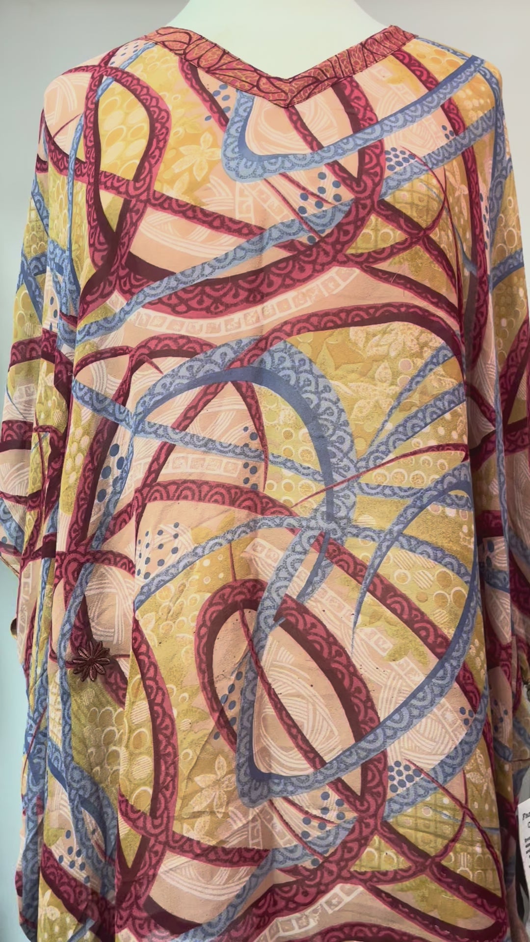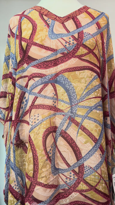 Our Tunic-Length Kaftan Tunic works in every season and works just as well at a date as at the beach. This kaftan is long enough to be worn as a beach cover-up but it can also be worn with pants or leggings in the fall and winter. Made from super-soft upcycled silk crepe saris, the fabric has a flattering drape on every figure.