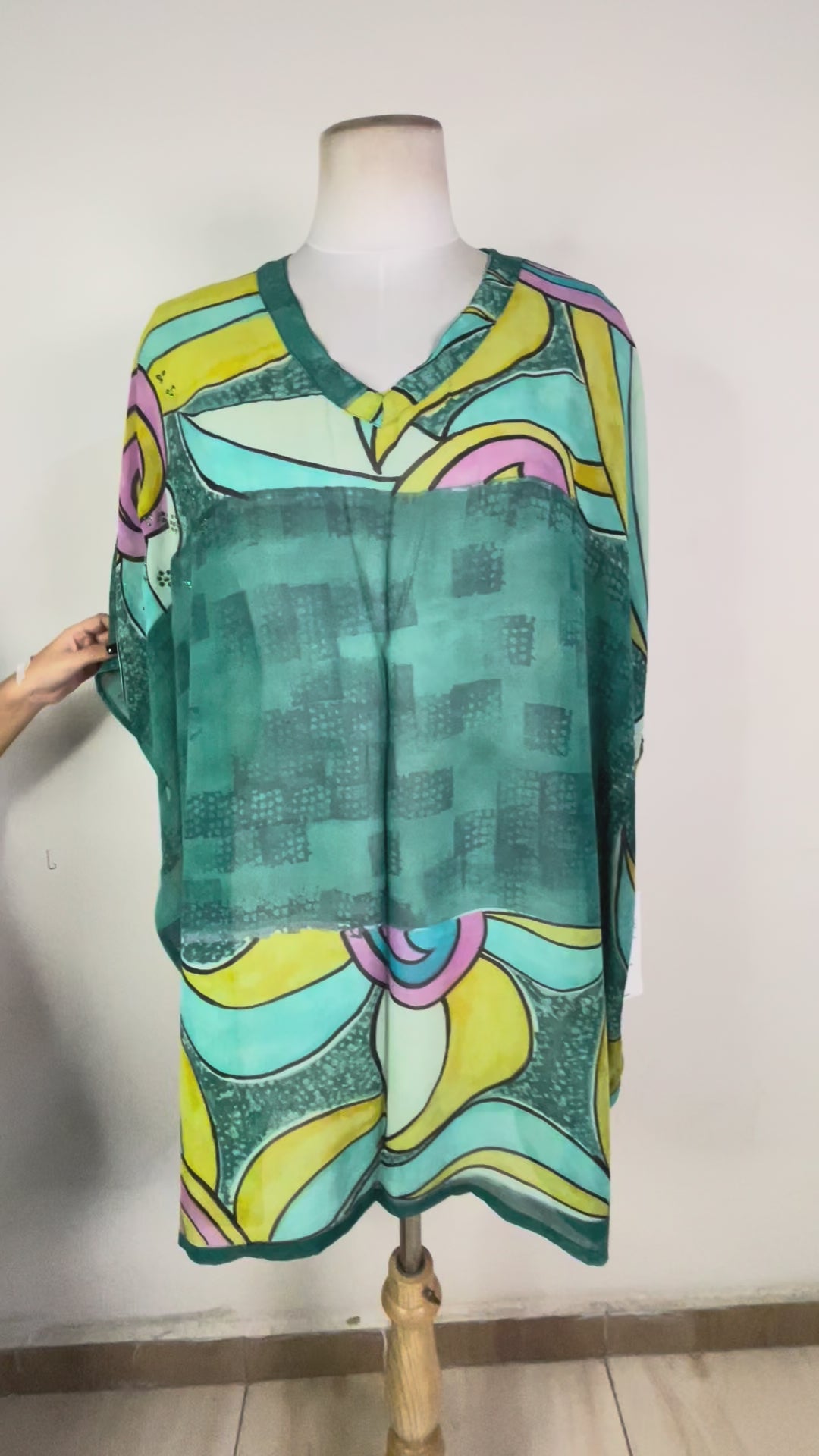 Our Tunic-Length Kaftan Tunic works in every season and works just as well at a date as at the beach. This kaftan is long enough to be worn as a beach cover-up but it can also be worn with pants or leggings in the fall and winter. Made from super-soft upcycled silk crepe saris, the fabric has a flattering drape on every figure.