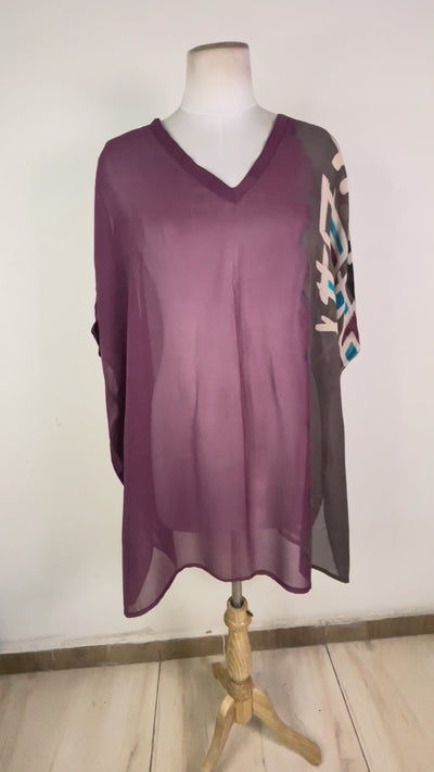 Our Tunic-Length Kaftan Tunic works in every season and works just as well at a date as at the beach. This kaftan is long enough to be worn as a beach cover-up but it can also be worn with pants or leggings in the fall and winter. Made from super-soft upcycled silk crepe saris, the fabric has a flattering drape on every figure.