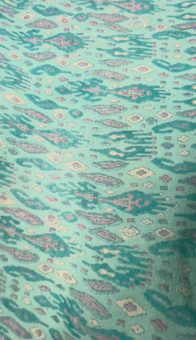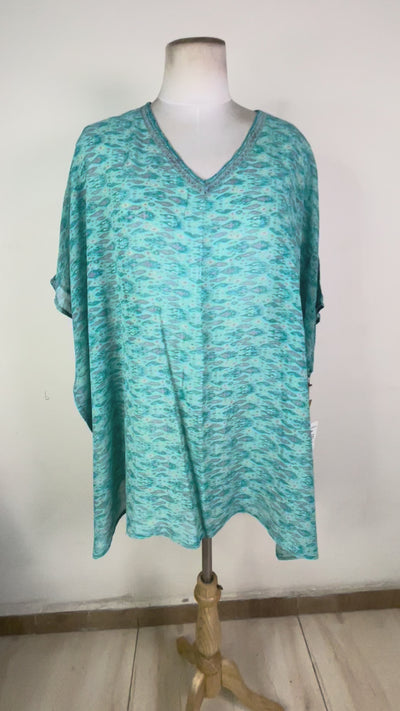 Our Tunic-Length Kaftan Tunic works in every season and works just as well at a date as at the beach. This kaftan is long enough to be worn as a beach cover-up but it can also be worn with pants or leggings in the fall and winter. Made from super-soft upcycled silk crepe saris, the fabric has a flattering drape on every figure.