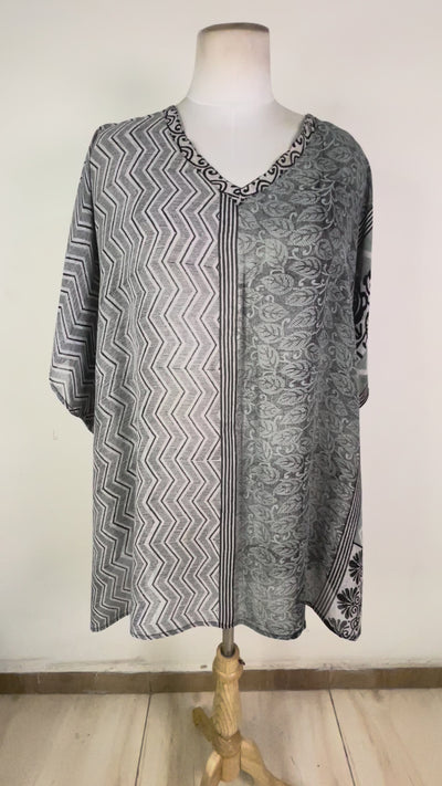 Our Tunic-Length Kaftan Tunic works in every season and works just as well at a date as at the beach. This kaftan is long enough to be worn as a beach cover-up but it can also be worn with pants or leggings in the fall and winter. Made from super-soft upcycled silk crepe saris, the fabric has a flattering drape on every figure.