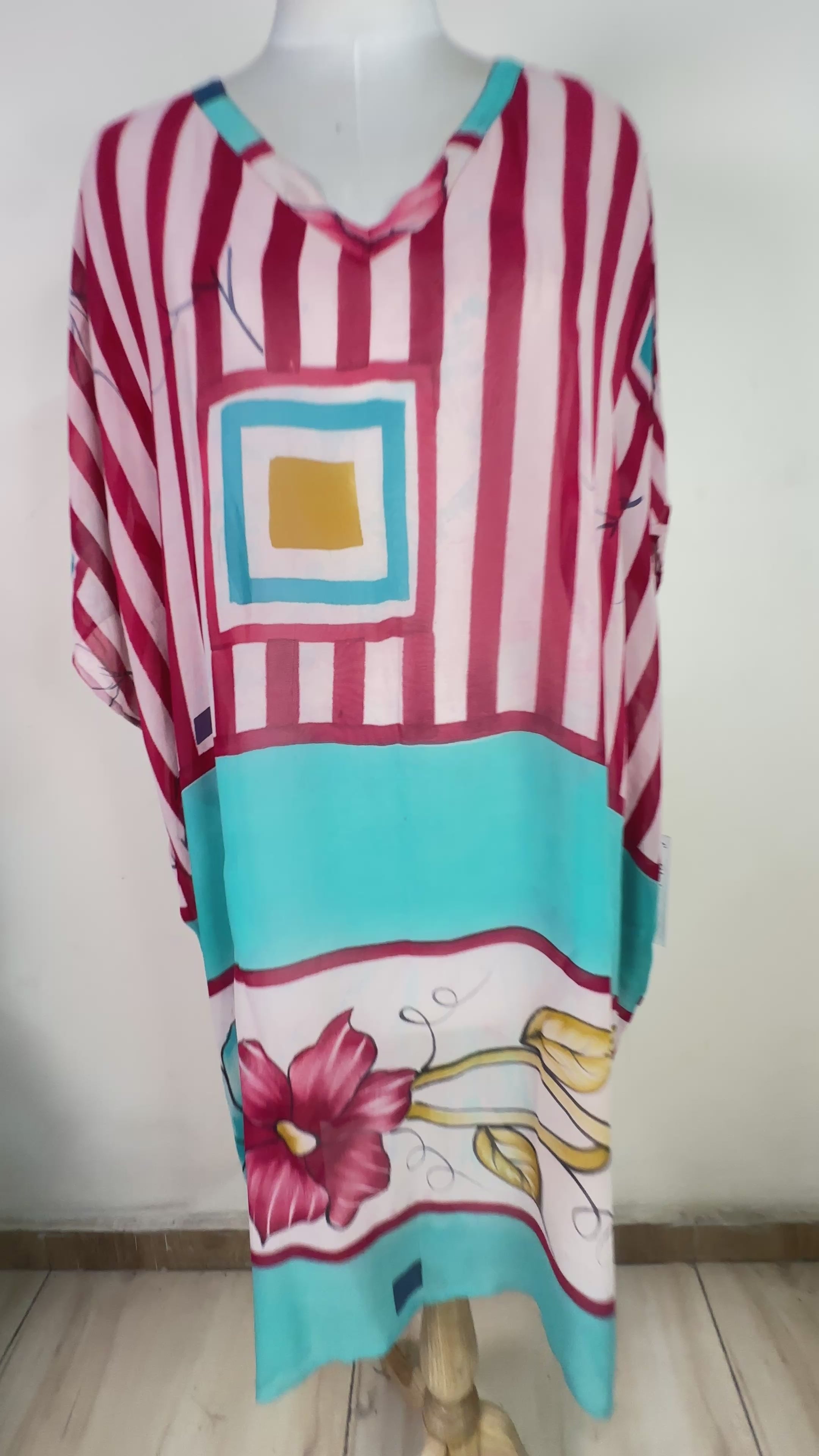 This midi-length kaftan brings style and sophistication to any occasion, from weddings to a beach day. Crafted from luxurious upcycled silk saris, the fabric has a beautiful flowing shape that flatters all body types. This kaftan dress can be worn as a single piece, or styled with pants for a fresh look. It's a one-size-fits-most item, so be sure to check the sizing chart for detailed measurements.