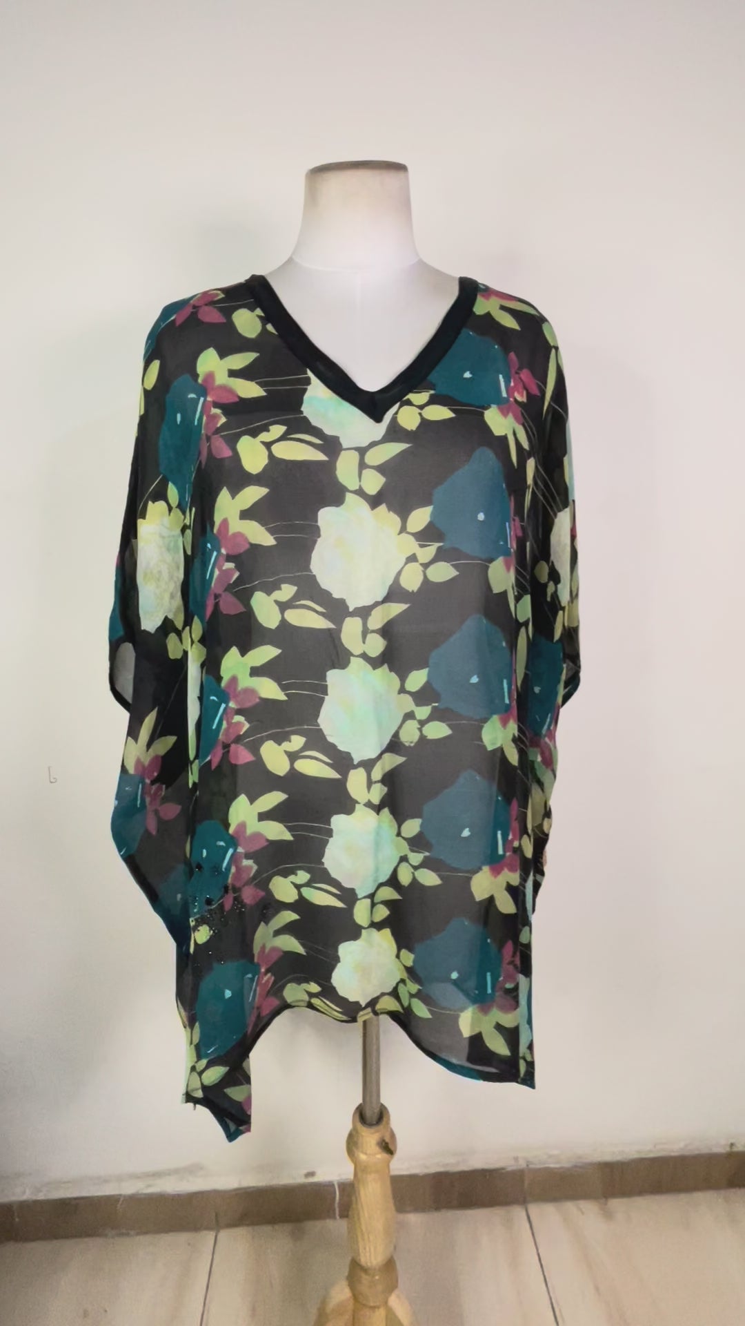 Our Tunic-Length Kaftan Tunic works in every season and works just as well at a date as at the beach. This kaftan is long enough to be worn as a beach cover-up but it can also be worn with pants or leggings in the fall and winter. Made from super-soft upcycled silk crepe saris, the fabric has a flattering drape on every figure.