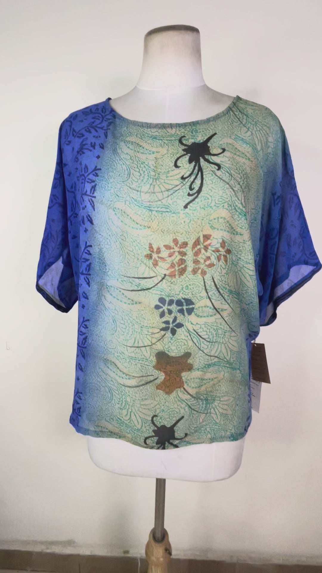 Sometimes you can see the sari-maker’s brand stamp on a piece of silk that we have transformed into another type of garment. We think the brand stamps are charming and that they don’t detract from our products, but because we also sell our clothing to boutiques around the world, we pull these “branded” products and add them to our wabi sabi or “perfectly imperfect” collection. Generally, if the piece you are interested in has a brand tag, you will be able to see its exact location in the product video.