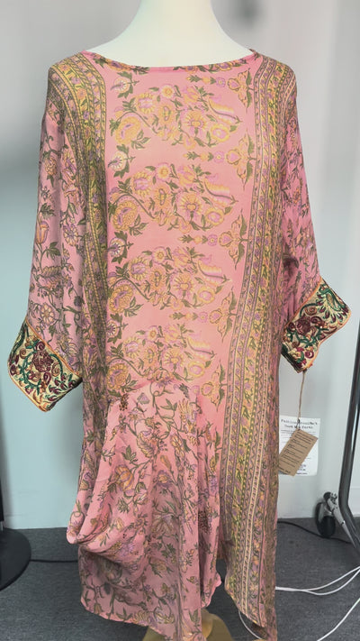 Customers are drawn to the unique, asymmetrical hemline and sculptural self-pocket design of this tunic, available in a multitude of colors and patterns. Crafted of upcycled crepe or georgette silk for supreme comfort and a flattering fit, this piece features a generous cut that fits most sizes. Confirm exact measurements on the Video tab below and explore styling tips with the accompanying video.