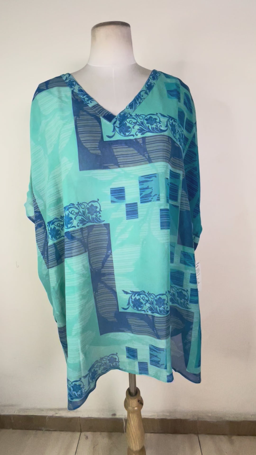 Our Tunic-Length Kaftan Tunic works in every season and works just as well at a date as at the beach. This kaftan is long enough to be worn as a beach cover-up but it can also be worn with pants or leggings in the fall and winter. Made from super-soft upcycled silk crepe saris, the fabric has a flattering drape on every figure.