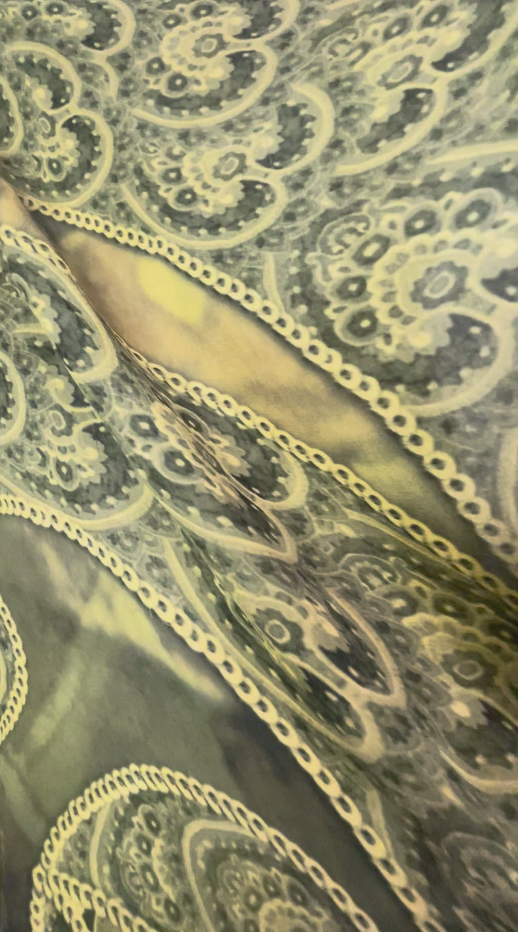 If you look very closely, you will see that the silks in this collection show some of the character of their previous incarnations through the appliqués that have been lovingly applied to bring new life to the fabric. This piece is a reminder that we are part of a collective journey to which we all add a little something.