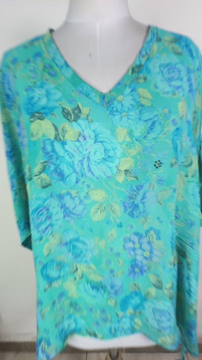 This tunic is long enough to provide full coverage, while adjustability is provided by side ties. This style accommodates all body types with a v-neckline on one side and a crew neckline on the other, so whichever side is worn to the front, you are sure to look great. Generously-cut so it fits sizes 2-18, but refer to the sizing tab for the exact measurements.