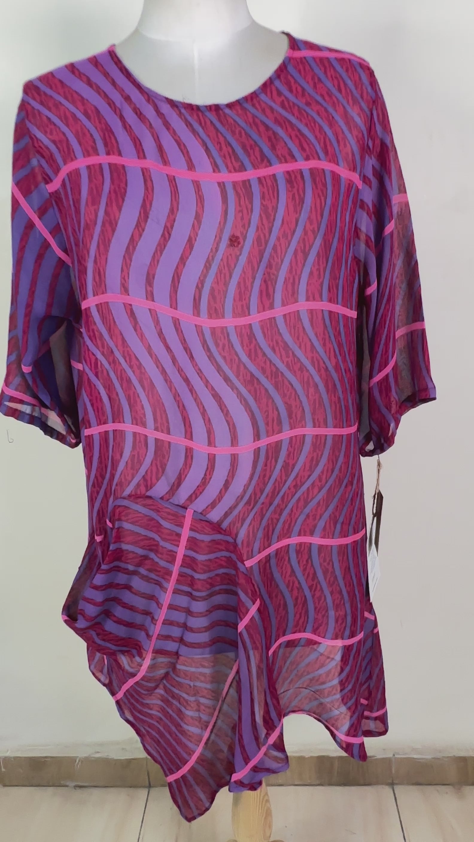 Customers are drawn to the unique, asymmetrical hemline and sculptural self-pocket design of this tunic, available in a multitude of colors and patterns. Crafted of upcycled crepe or georgette silk for supreme comfort and a flattering fit, this piece features a generous cut that fits most sizes. Confirm exact measurements on the Video tab below and explore styling tips with the accompanying video.