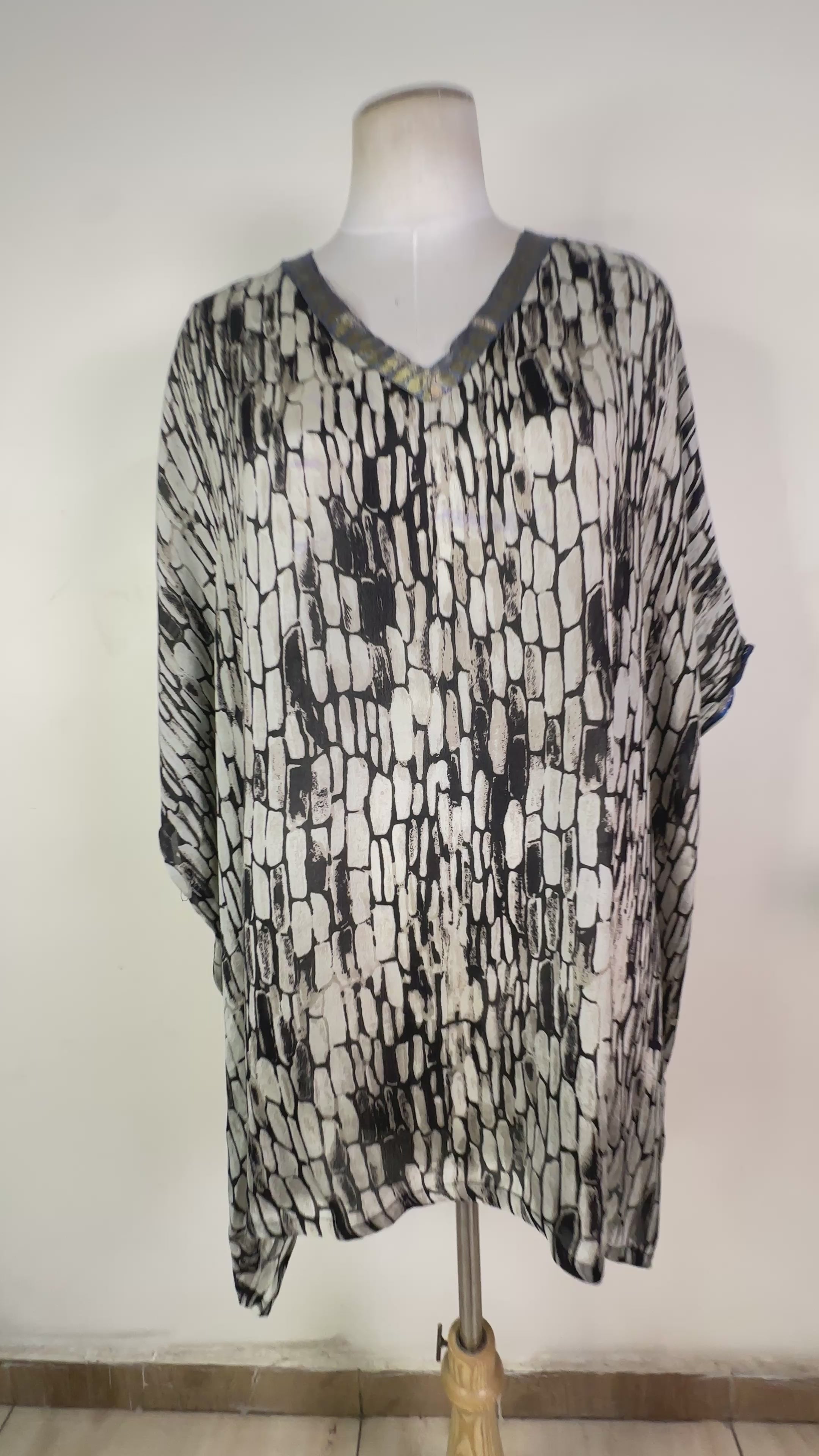 Our Tunic-Length Kaftan Tunic works in every season and works just as well at a date as at the beach. This kaftan is long enough to be worn as a beach cover-up but it can also be worn with pants or leggings in the fall and winter. Made from super-soft upcycled silk crepe saris, the fabric has a flattering drape on every figure.