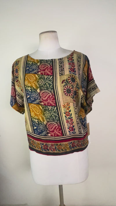 These sustainable, pure silk boxy tops are versatile and come in countless colors and prints. They look great when paired with a longer tank top and high-waisted pants, or beneath a coordinating kimono-sleeved duster, short kimono-sleeved jacket, or silk poncho. These pieces are one size, best fitting sizes 2-12, but please consult the product description for exact measurements.