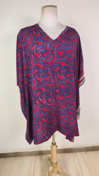 Our Tunic-Length Kaftan Tunic works in every season and works just as well at a date as at the beach. This kaftan is long enough to be worn as a beach cover-up but it can also be worn with pants or leggings in the fall and winter. Made from super-soft upcycled silk crepe saris, the fabric has a flattering drape on every figure.