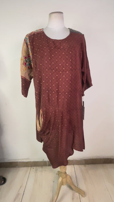 Customers are drawn to the unique, asymmetrical hemline and sculptural self-pocket design of this tunic, available in a multitude of colors and patterns. Crafted of upcycled crepe or georgette silk for supreme comfort and a flattering fit, this piece features a generous cut that fits most sizes. Confirm exact measurements on the Video tab below and explore styling tips with the accompanying video.