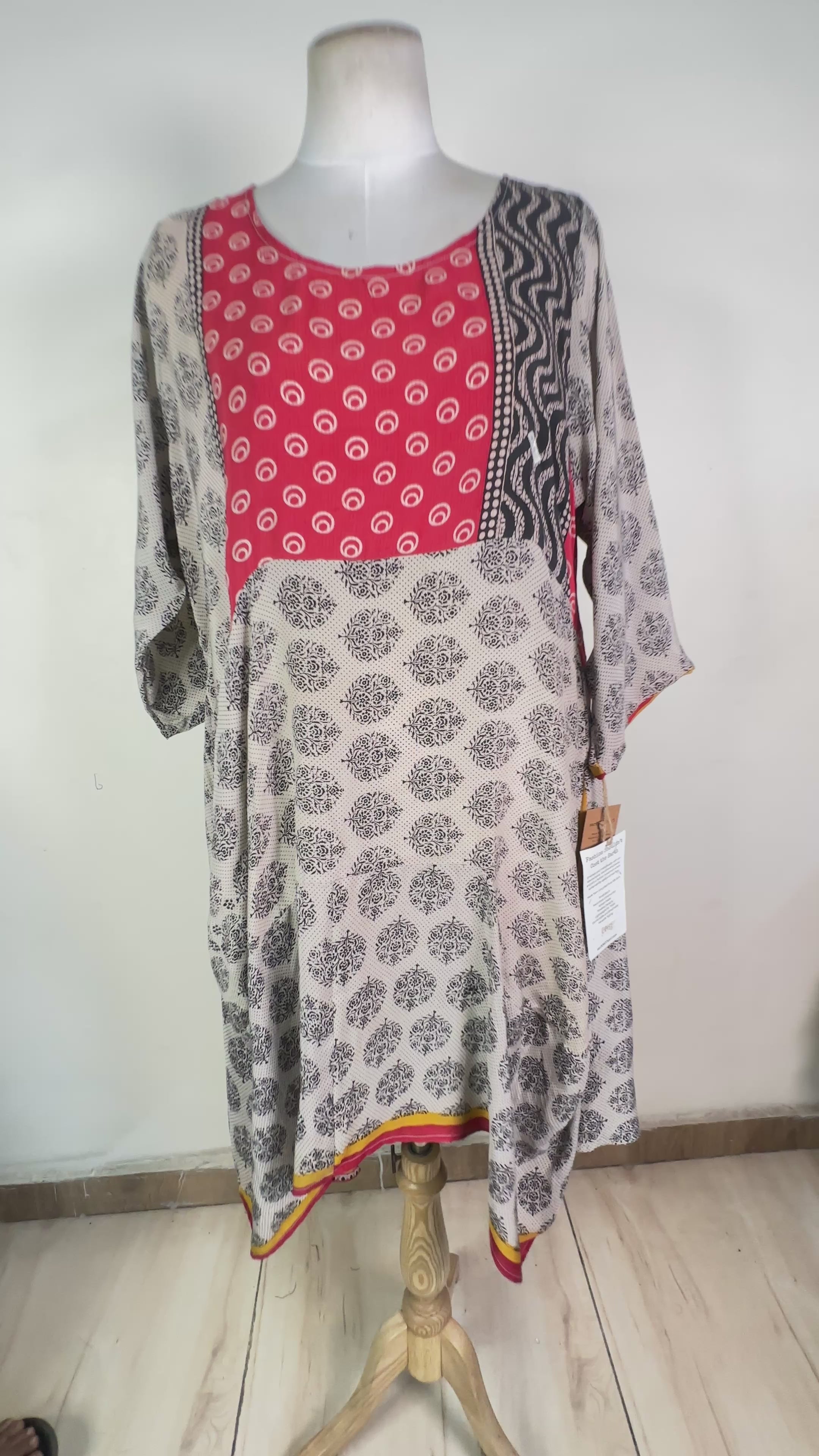 Sometimes you can see the sari-maker’s brand stamp on a piece of silk that we have transformed into another type of garment. We think the brand stamps are charming and that they don’t detract from our products, but because we also sell our clothing to boutiques around the world, we pull these “branded” products and add them to our wabi sabi or “perfectly imperfect” collection. Generally, if the piece you are interested in has a brand tag, you will be able to see its exact location in the product video.