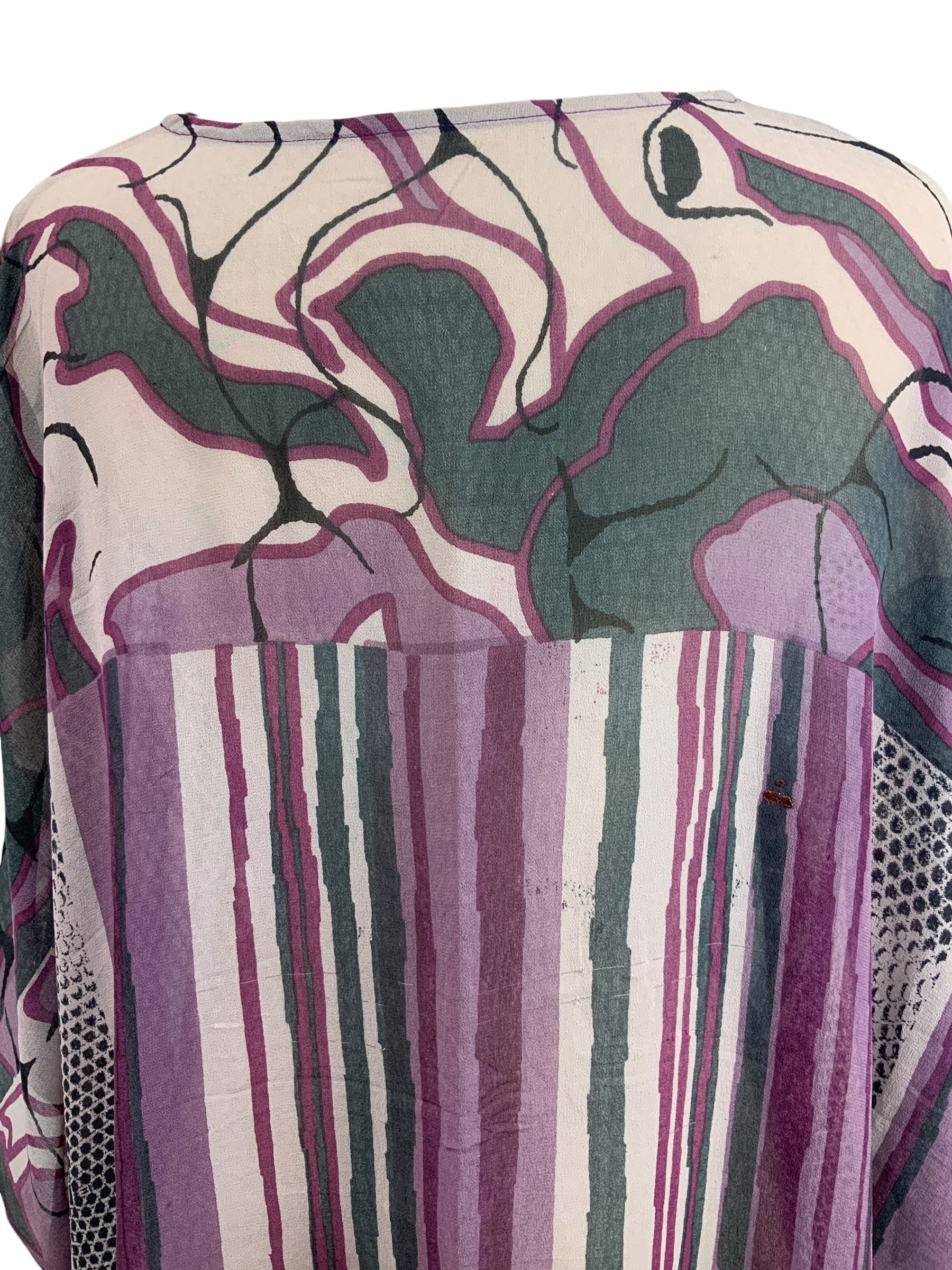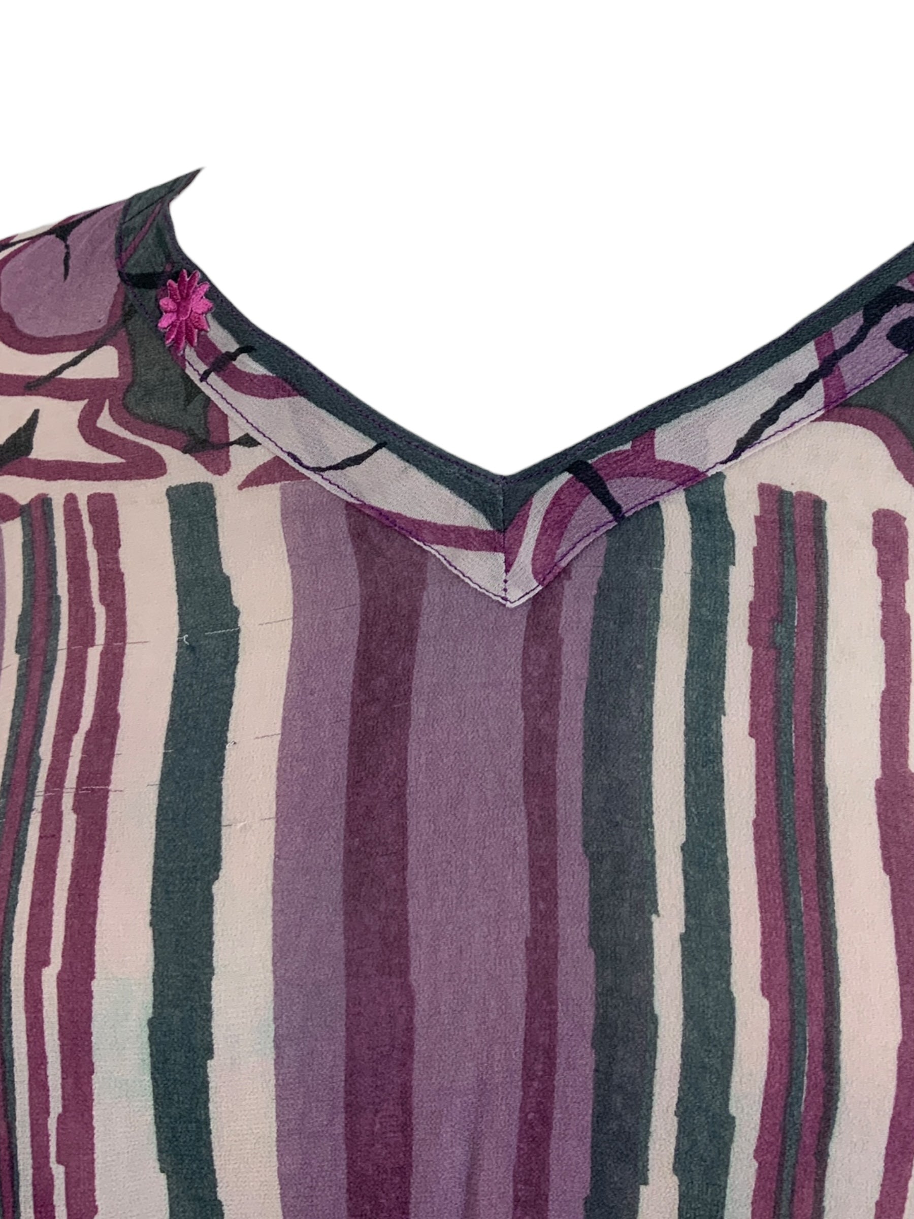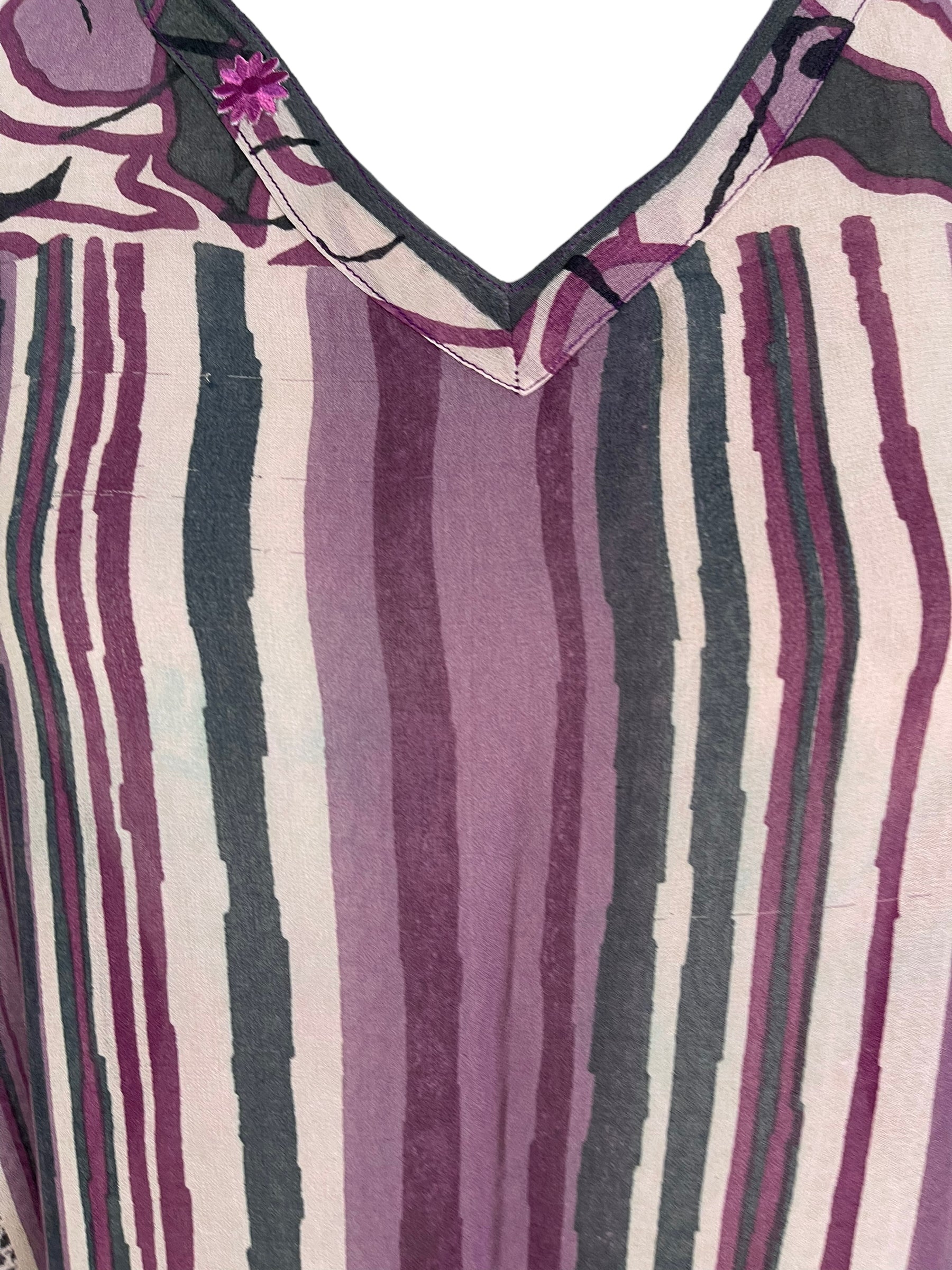 This midi-length kaftan brings style and sophistication to any occasion, from weddings to a beach day. Crafted from luxurious upcycled silk saris, the fabric has a beautiful flowing shape that flatters all body types. This kaftan dress can be worn as a single piece, or styled with pants for a fresh look. It's a one-size-fits-most item, so be sure to check the sizing chart for detailed measurements.