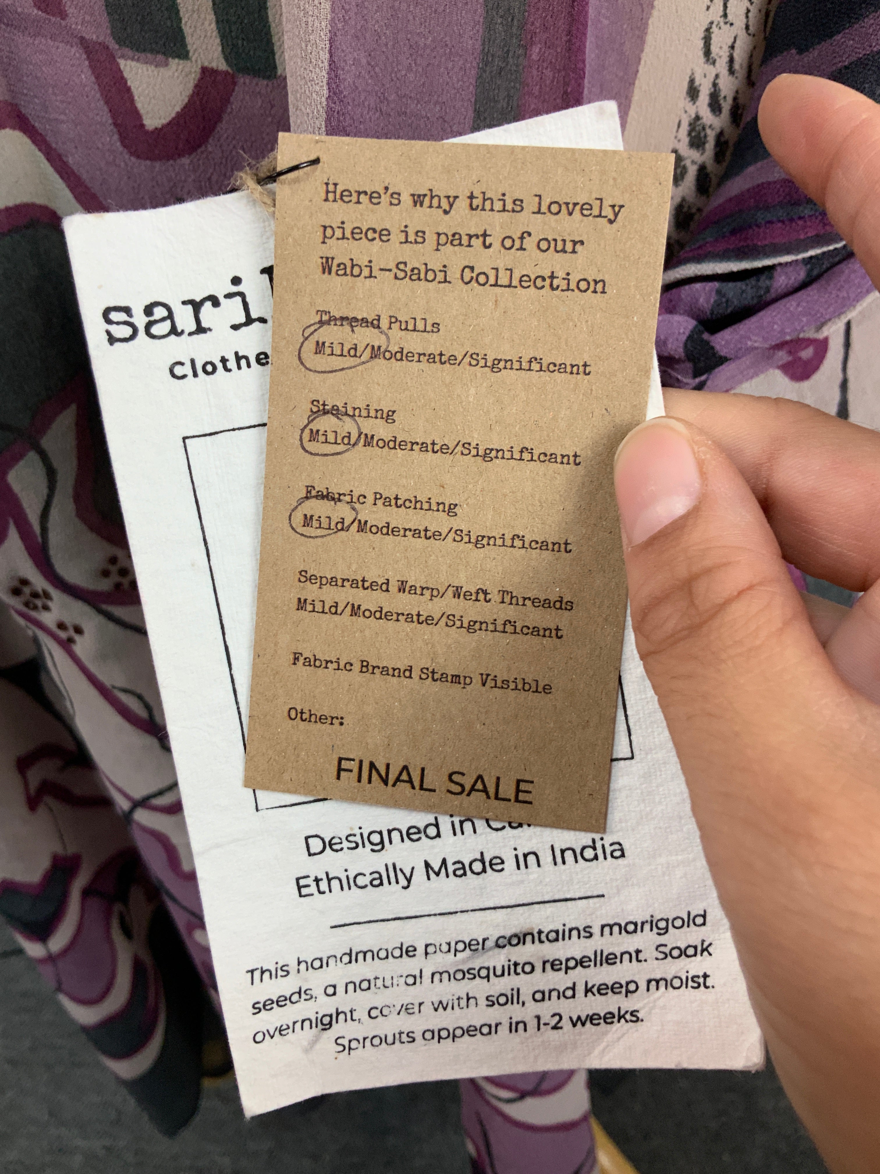 As you know, each sariKNOTsari piece of silk clothing is made from a vintage sari. Indian ladies often use pins to fasten their sari pleats in place and these pins can sometimes lead to pinholes and threads pulls. Also, in order to add durability and weight to the bottom of the sari, women will attach a cotton strip, called a “fall”, to the bottom hem of their saris. When we remove the fall in order to reimagine the piece of silk, there are inevitably small holes in the fabric. These tiny holes do not jeopardize the integrity of the fabric, as they are the result of the warp and weft threads being separated rather than broken. We categorize these types of fabric issues as mild, moderate and significant. Please watch the video that accompanies the wabi sabi product for more details about the specific fabric issues in the piece you are considering purchasing.
