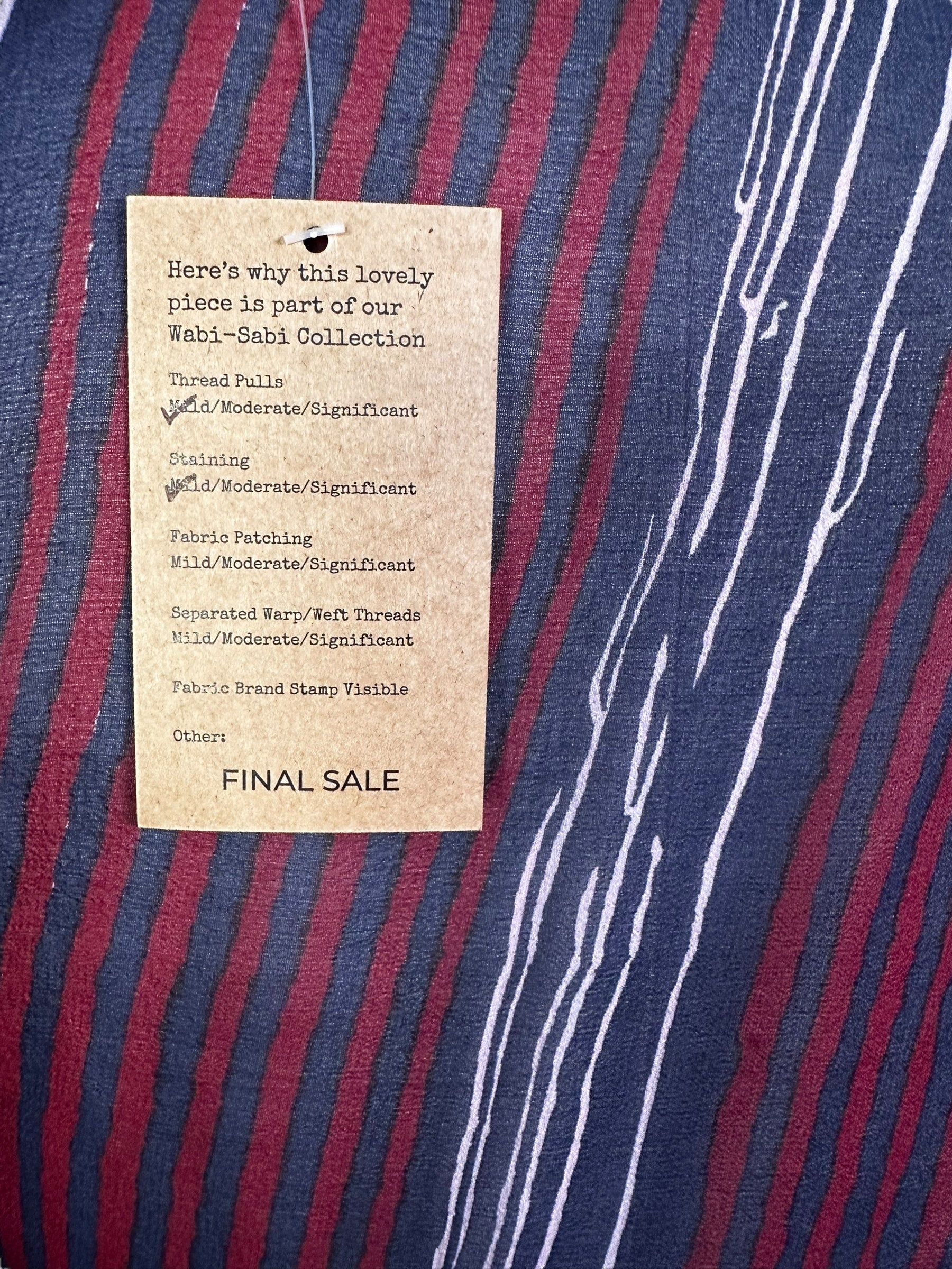 Wabi sabi pieces have flaws that we have tried to highlight in the images. We feel these pieces are still beautiful to wear and in most cases, you are the only one who will know that the piece has "flaws". Feel free to contact us for additional pictures or if you have any questions. For a description of the types of flaws that are mentioned in the attached video, check out the tab “Types of Wabi Sabi Fabric Issues”. Please watch the video in the product images to learn more about the "flaws" in this particular piece.Wabi sabi pieces are final sale.