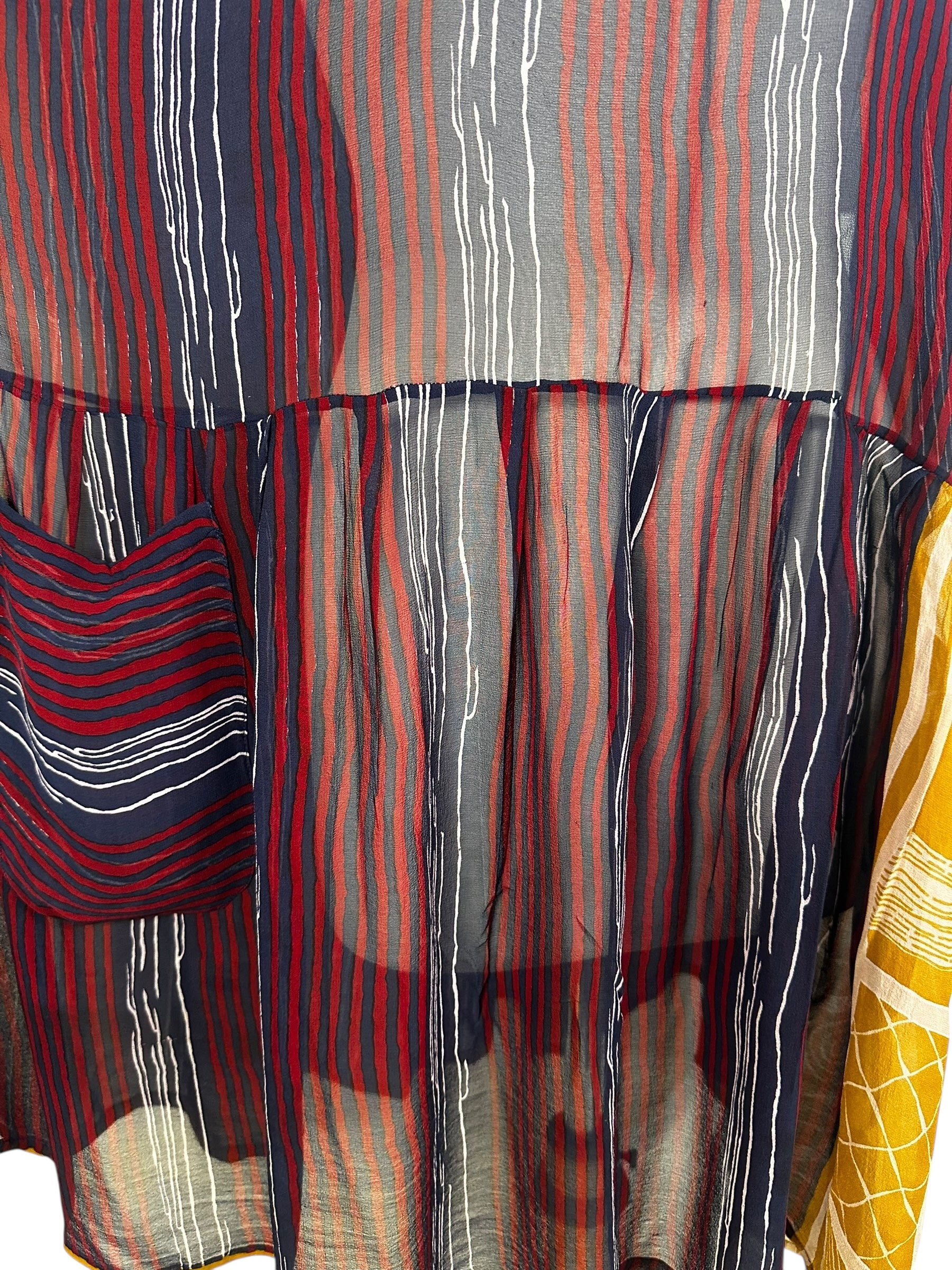 In Eastern philosophy, an Avatar is an incarnation that teaches how to evolve virtues of the past into the present. The Pure Upcycled Silk Avatar Collection is made from vintage pure silk saris, chosen and worn by women in the past to celebrate their lives. If you look very closely, you will see that the silks in this collection show some of the character of their previous incarnations through the appliqués that have been lovingly applied to bring new life to the fabric. This piece is a reminder that we are part of a collective journey to which we all add a little something.