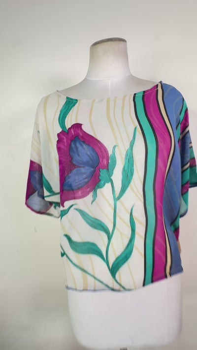 These sustainable, pure silk boxy tops are versatile and come in countless colors and prints. They look great when paired with a longer tank top and high-waisted pants, or beneath a coordinating kimono-sleeved duster, short kimono-sleeved jacket, or silk poncho. These pieces are one size, best fitting sizes 2-12, but please consult the product description for exact measurements.