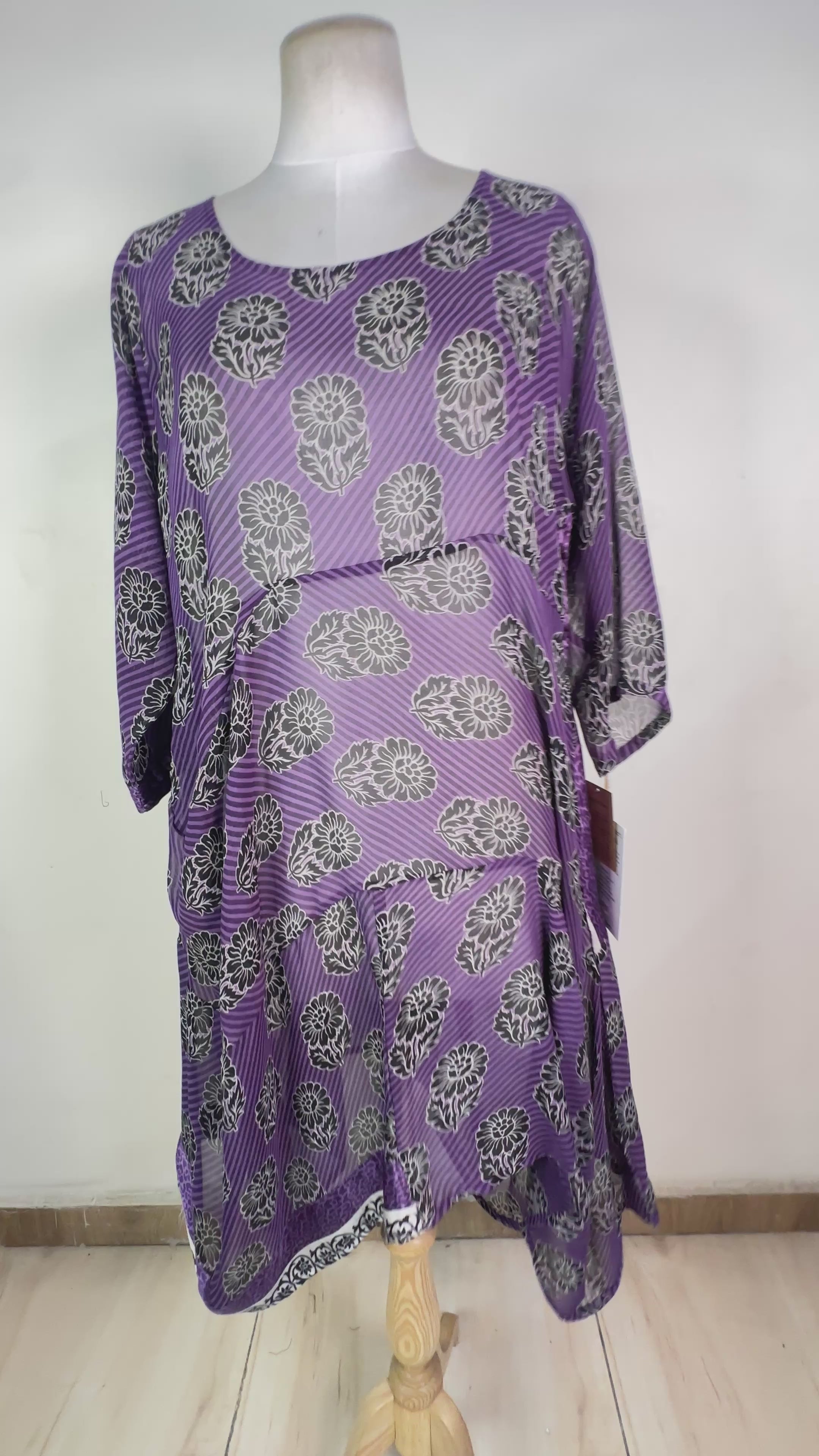 Sometimes you can see the sari-maker’s brand stamp on a piece of silk that we have transformed into another type of garment. We think the brand stamps are charming and that they don’t detract from our products, but because we also sell our clothing to boutiques around the world, we pull these “branded” products and add them to our wabi sabi or “perfectly imperfect” collection. Generally, if the piece you are interested in has a brand tag, you will be able to see its exact location in the product video.