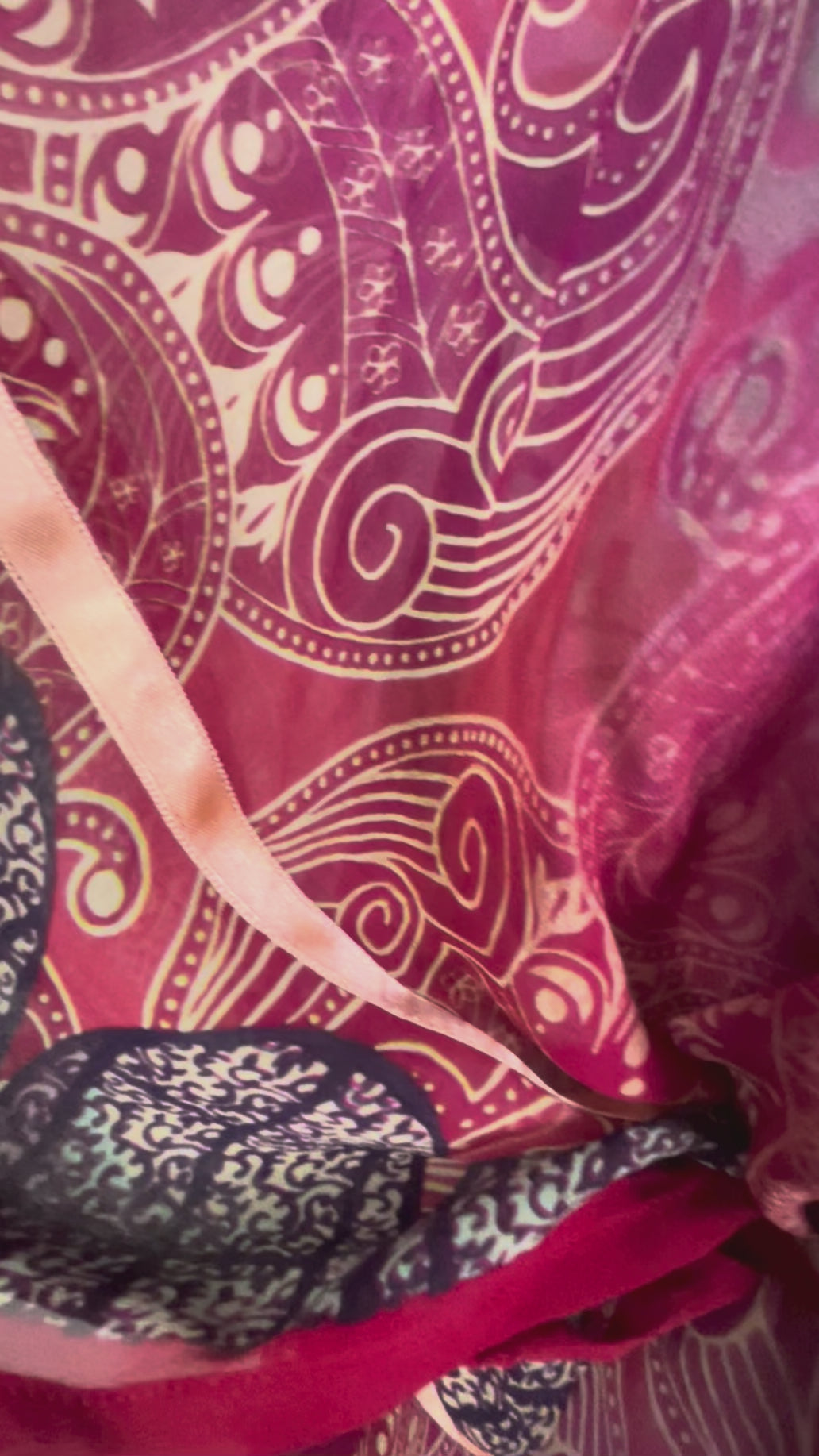 In Eastern philosophy, an Avatar is an incarnation that teaches how to evolve virtues of the past into the present. The Pure Upcycled Silk Avatar Collection is made from vintage pure silk saris, chosen and worn by women in the past to celebrate their lives.If you look very closely, you will see that the silks in this collection show some of the character of their previous incarnations through the appliqués that have been lovingly applied to bring new life to the fabric. This piece is a reminder that we are part of a collective journey to which we all add a little something.
