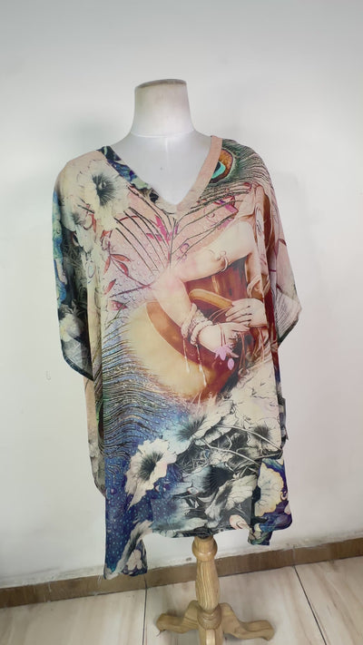 Our Tunic-Length Kaftan Tunic works in every season and works just as well at a date as at the beach. This kaftan is long enough to be worn as a beach cover-up but it can also be worn with pants or leggings in the fall and winter. Made from super-soft upcycled silk crepe saris, the fabric has a flattering drape on every figure.