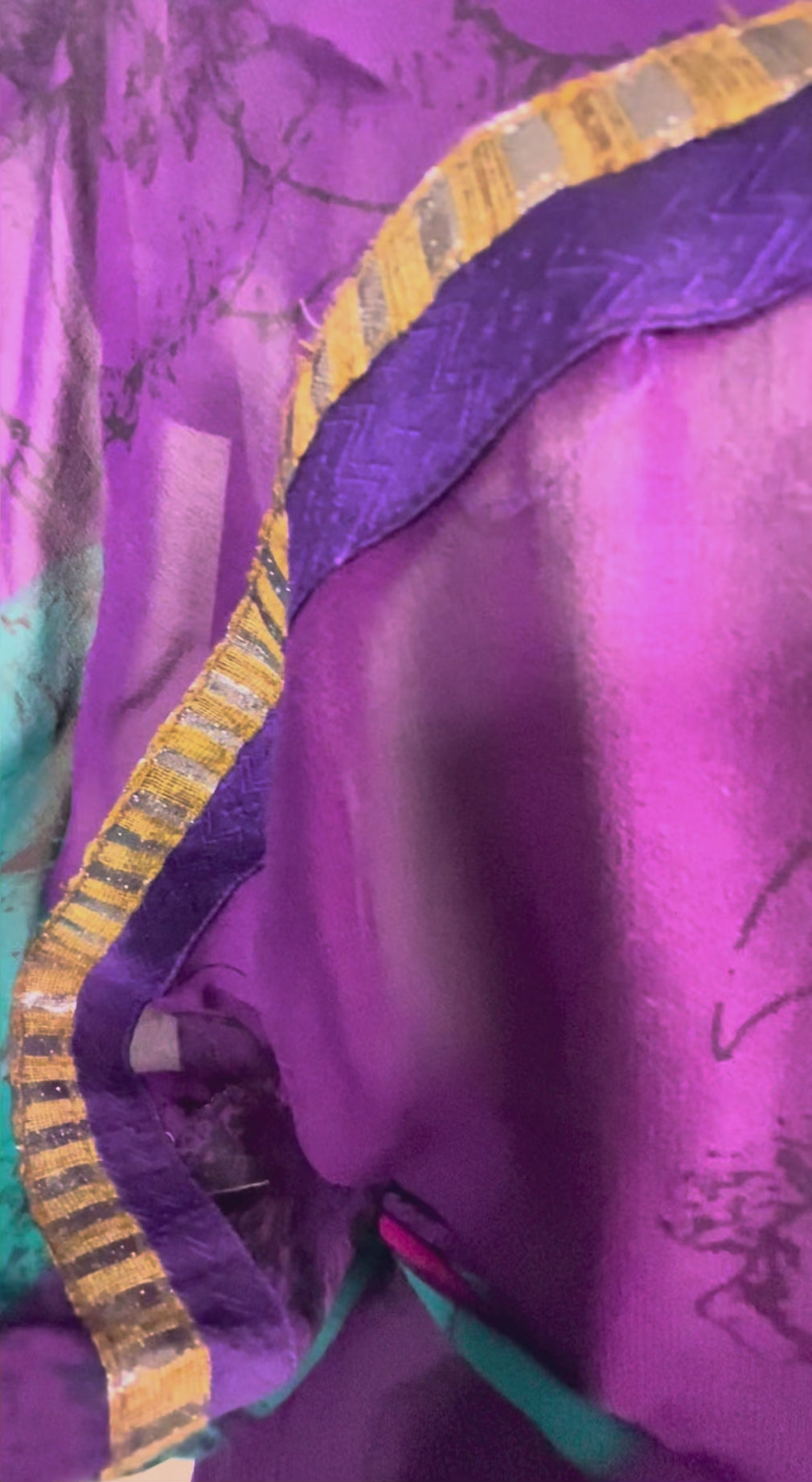 In Eastern philosophy, an Avatar is an incarnation that teaches how to evolve virtues of the past into the present. The Pure Upcycled Silk Avatar Collection is made from vintage pure silk saris, chosen and worn by women in the past to celebrate their lives.If you look very closely, you will see that the silks in this collection show some of the character of their previous incarnations through the appliqués that have been lovingly applied to bring new life to the fabric. This piece is a reminder that we are part of a collective journey to which we all add a little something.